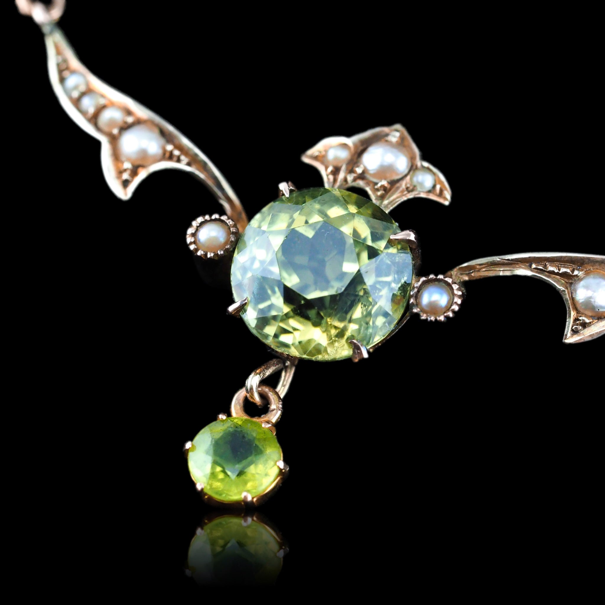 Furthermore, the intricacy and superb craftsmanship is evident in the very fine mounts and graduating seed pearls which have been meticulously set. Not only does such a design serve as a testament to the goldsmith's skill, but it also accentuates the central peridots, allowing them to glisten in their best light.