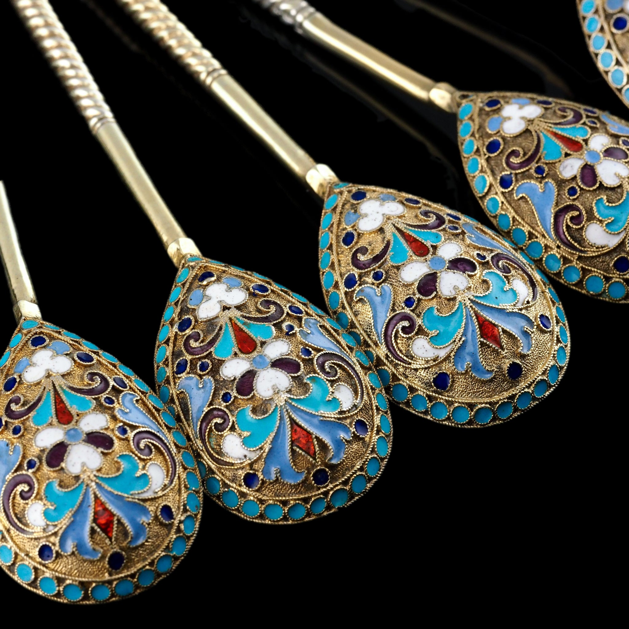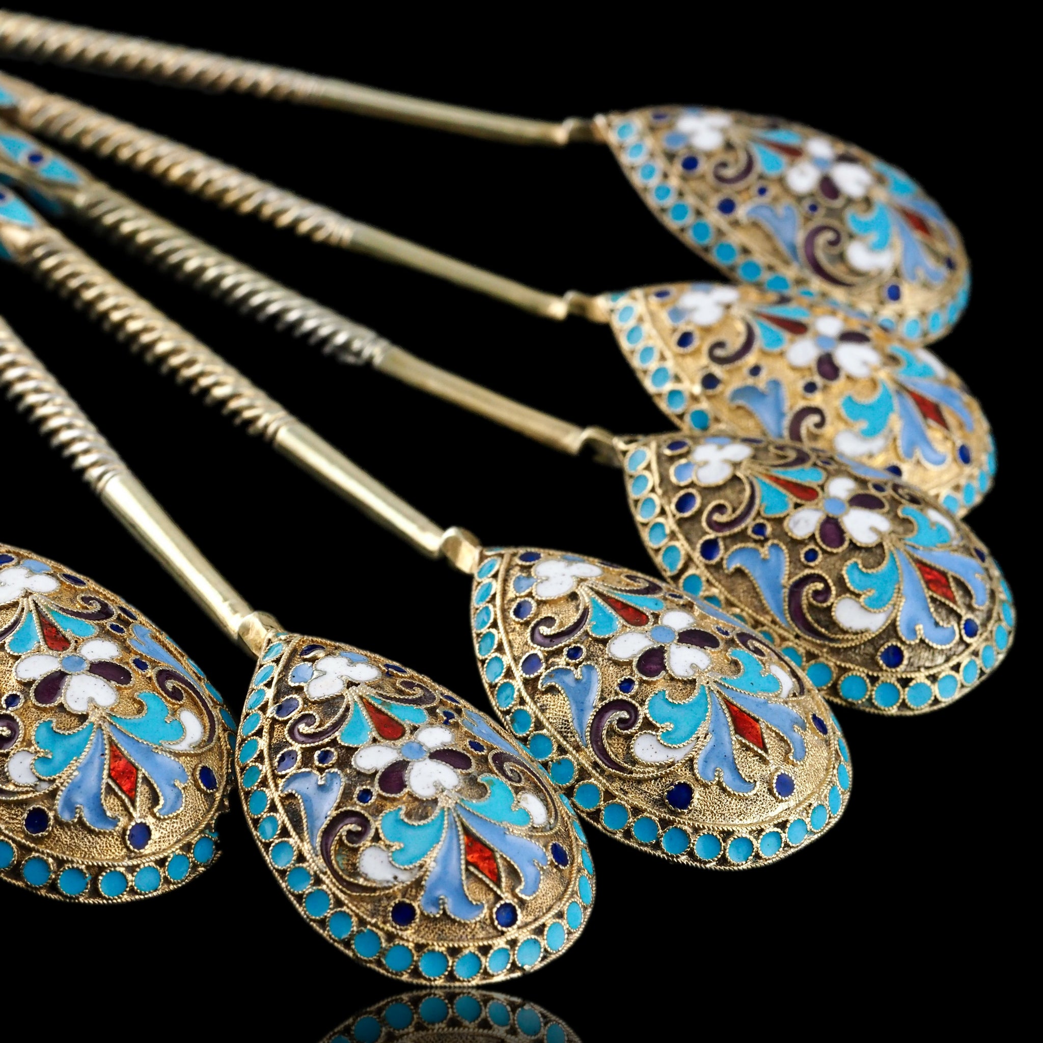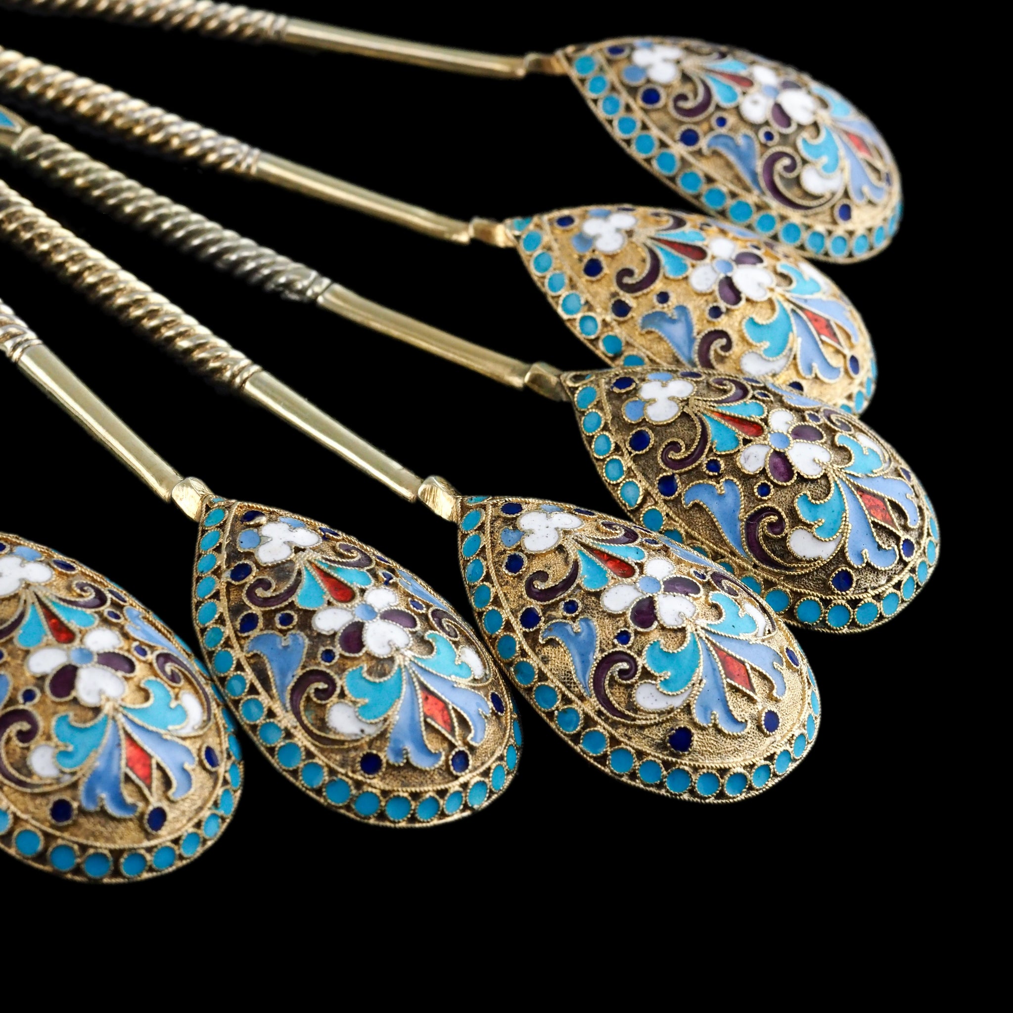 The magnificent cloisonne-work, typical of fine 19th c. Russian silver enamelware, whilst intricate and splendid on every single piece, truly comes to life when in a set and amongst one another.