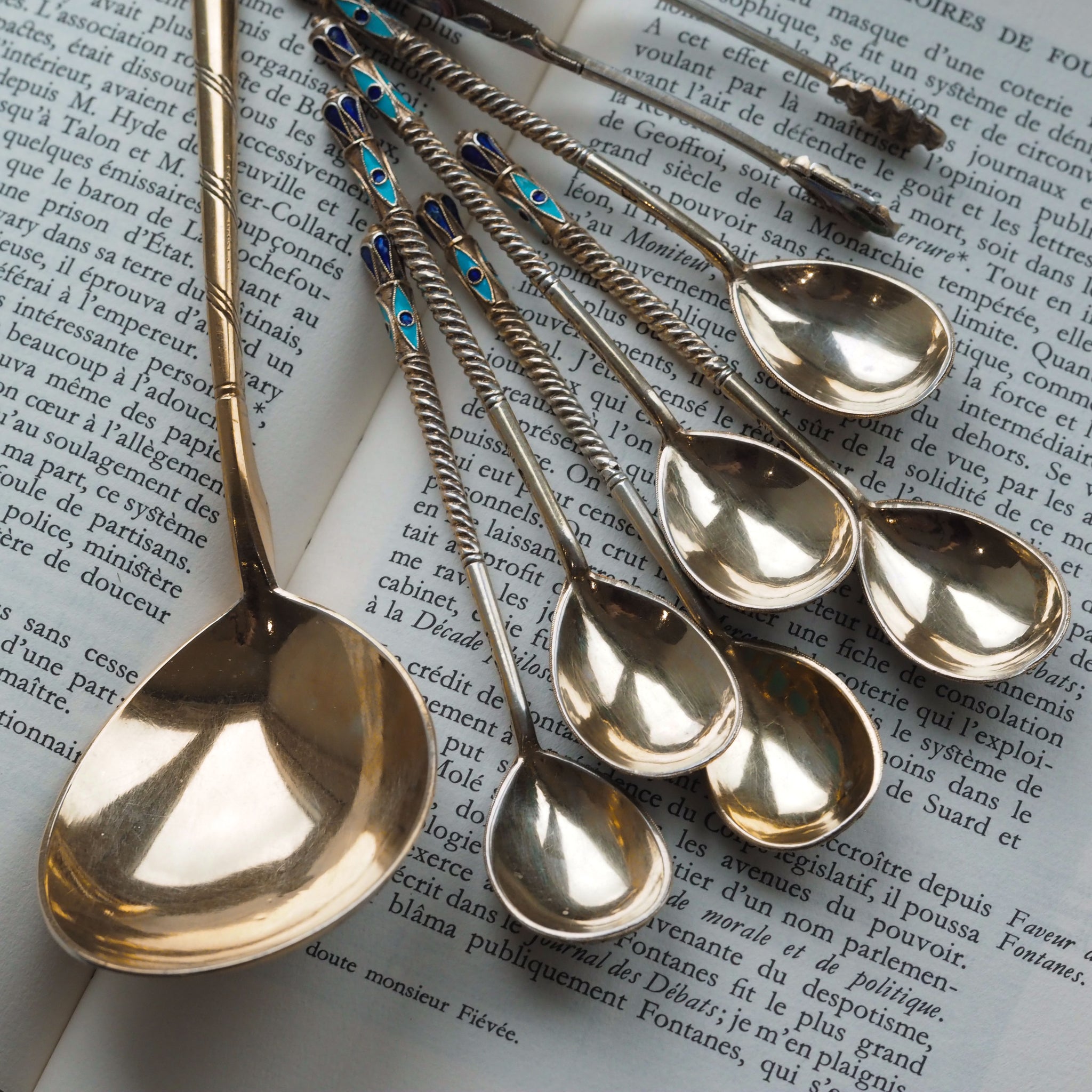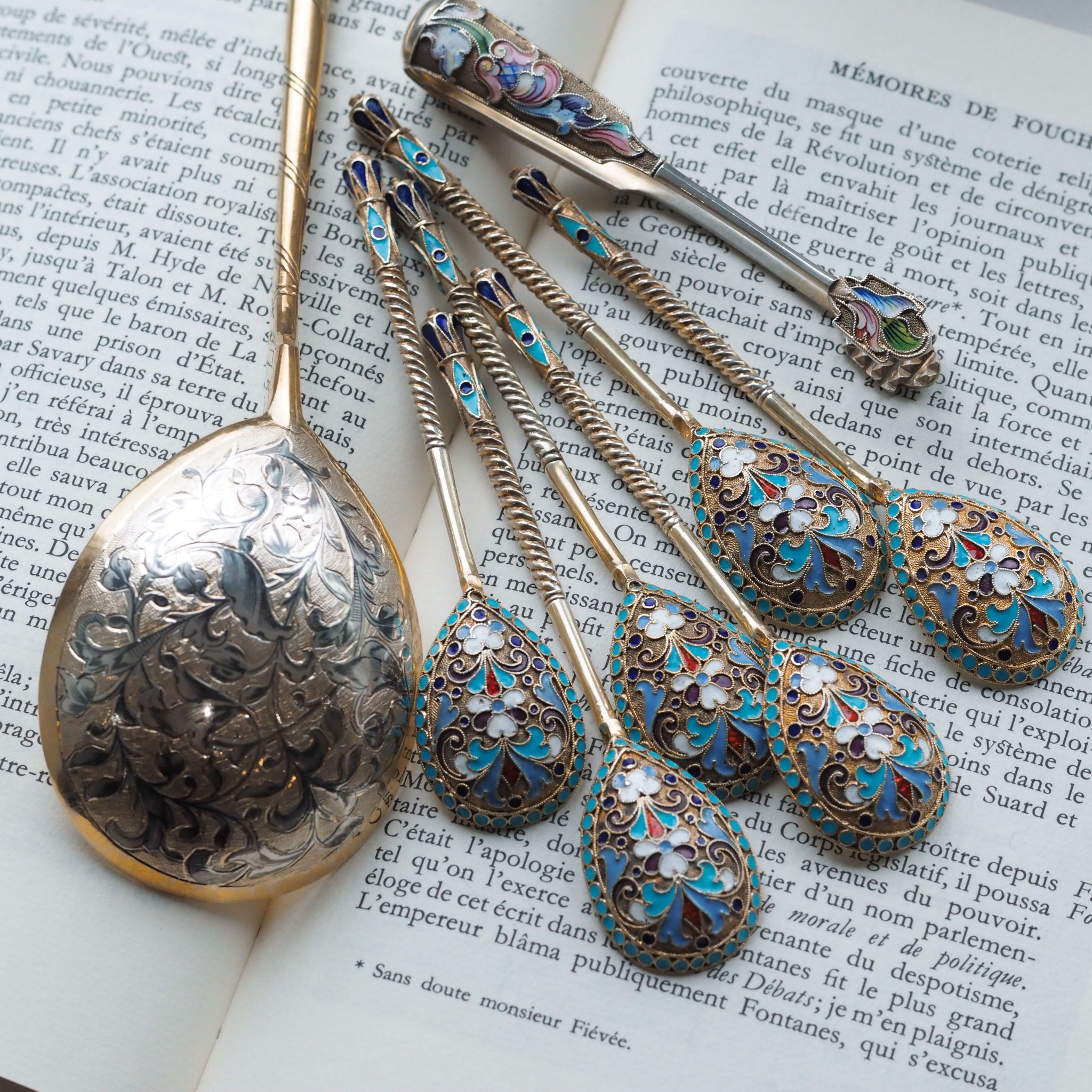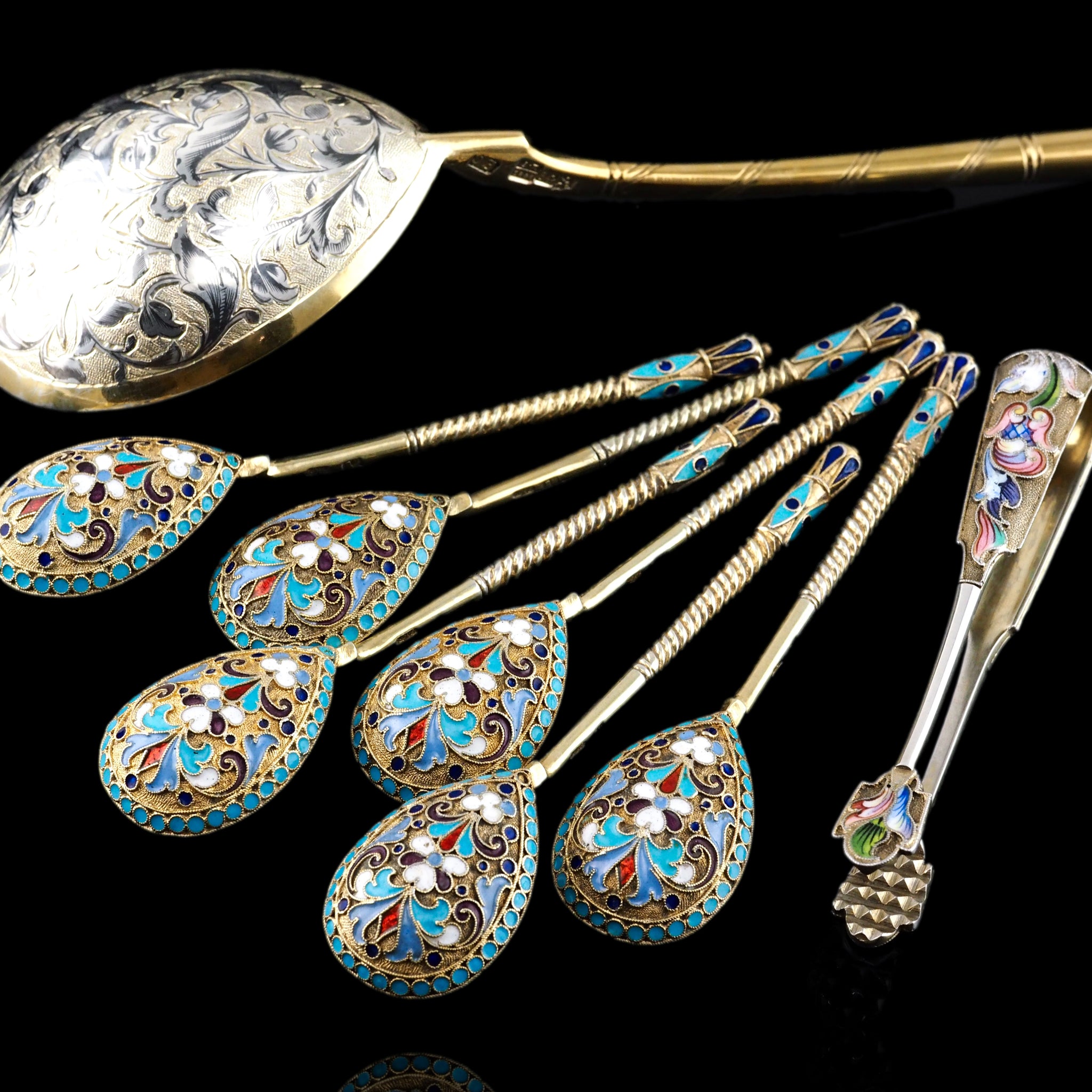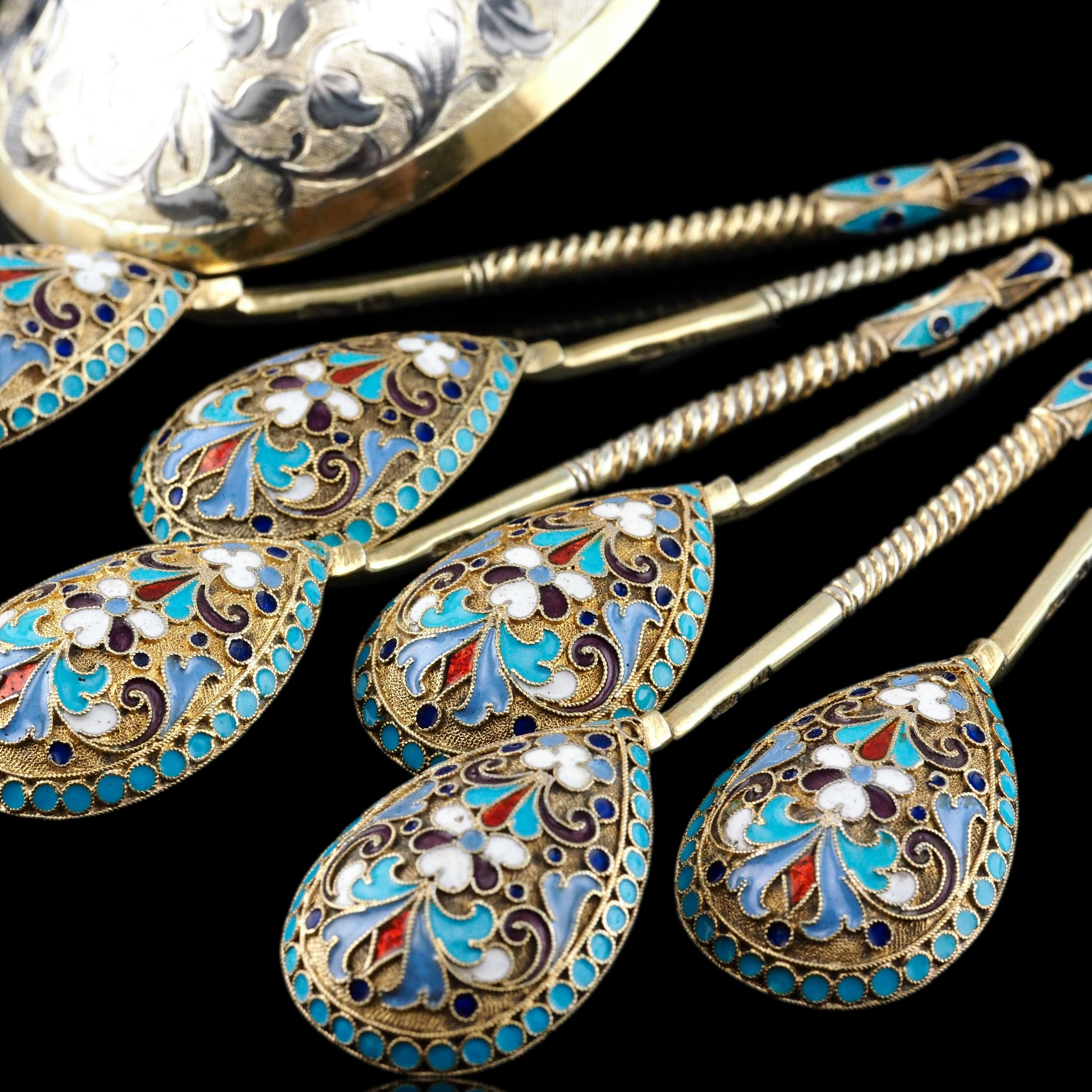 The magnificent cloisonne-work, typical of fine 19th c. Russian silver enamelware, whilst intricate and splendid on every single piece, truly comes to life when in a set and amongst one another.