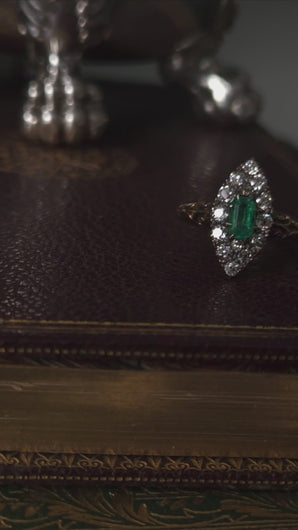 Distinctly Victorian and distinguished from contemporary pieces, this gorgeous piece presents one central 'emerald-cut' emerald encompassed by 14 old mine-cut diamonds (approx 0.45ct total) that glisten wonderfully under lighting.