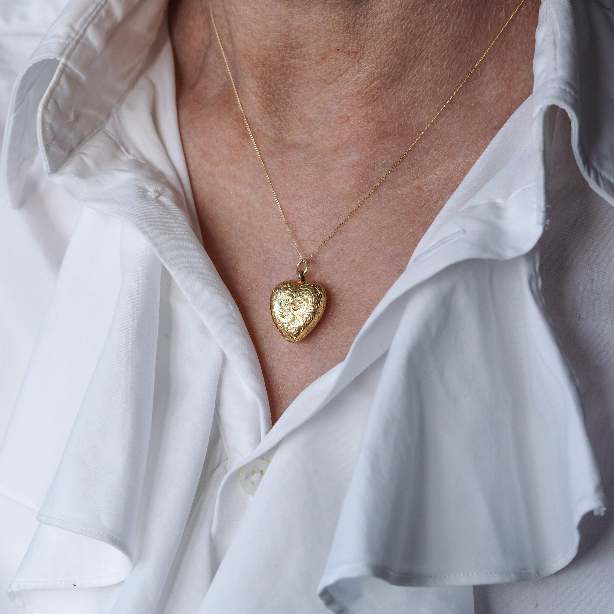 The heart locket has been meticulously hand-engraved with the most splendid scrolled acanthus motifs which not only reflect light wonderfully but also display the high level of goldsmithing and craftsmanship of the period.