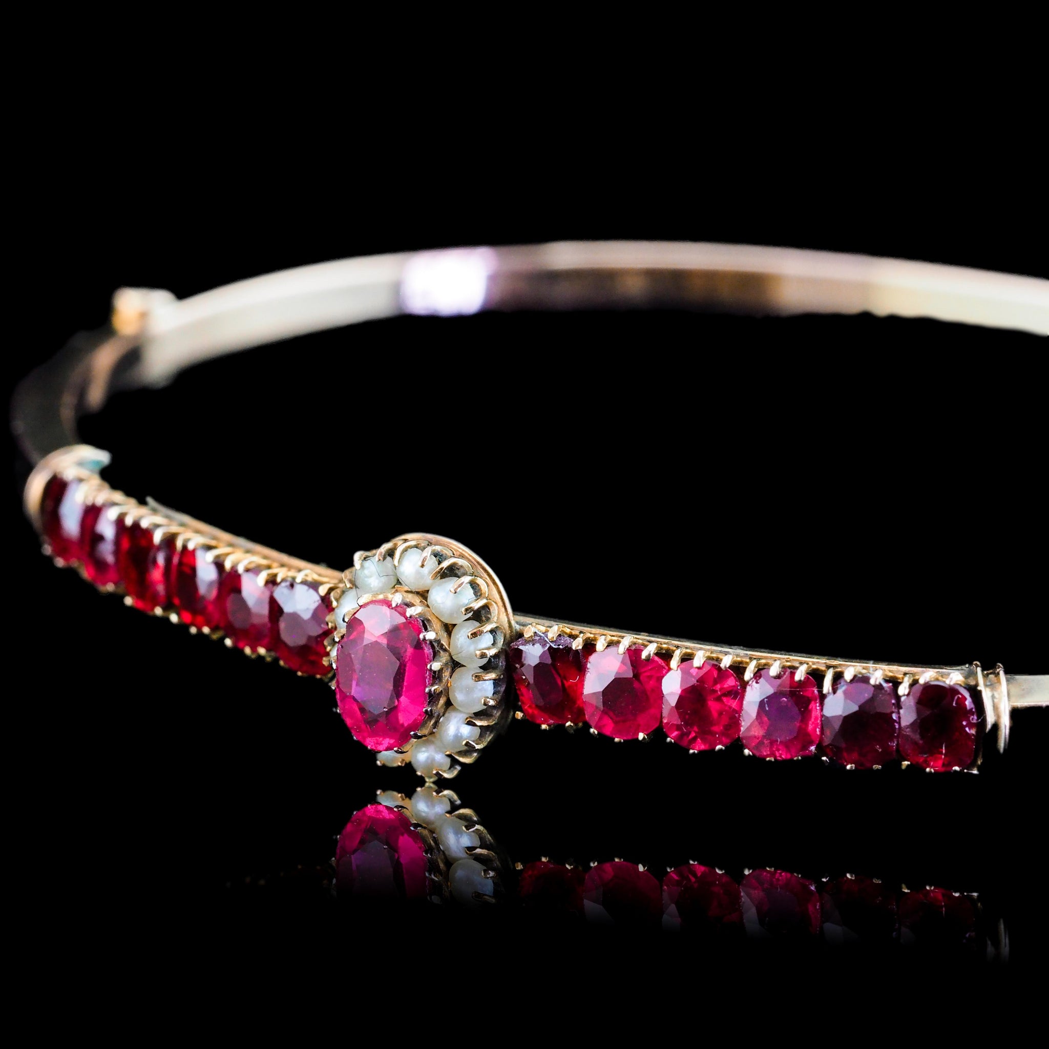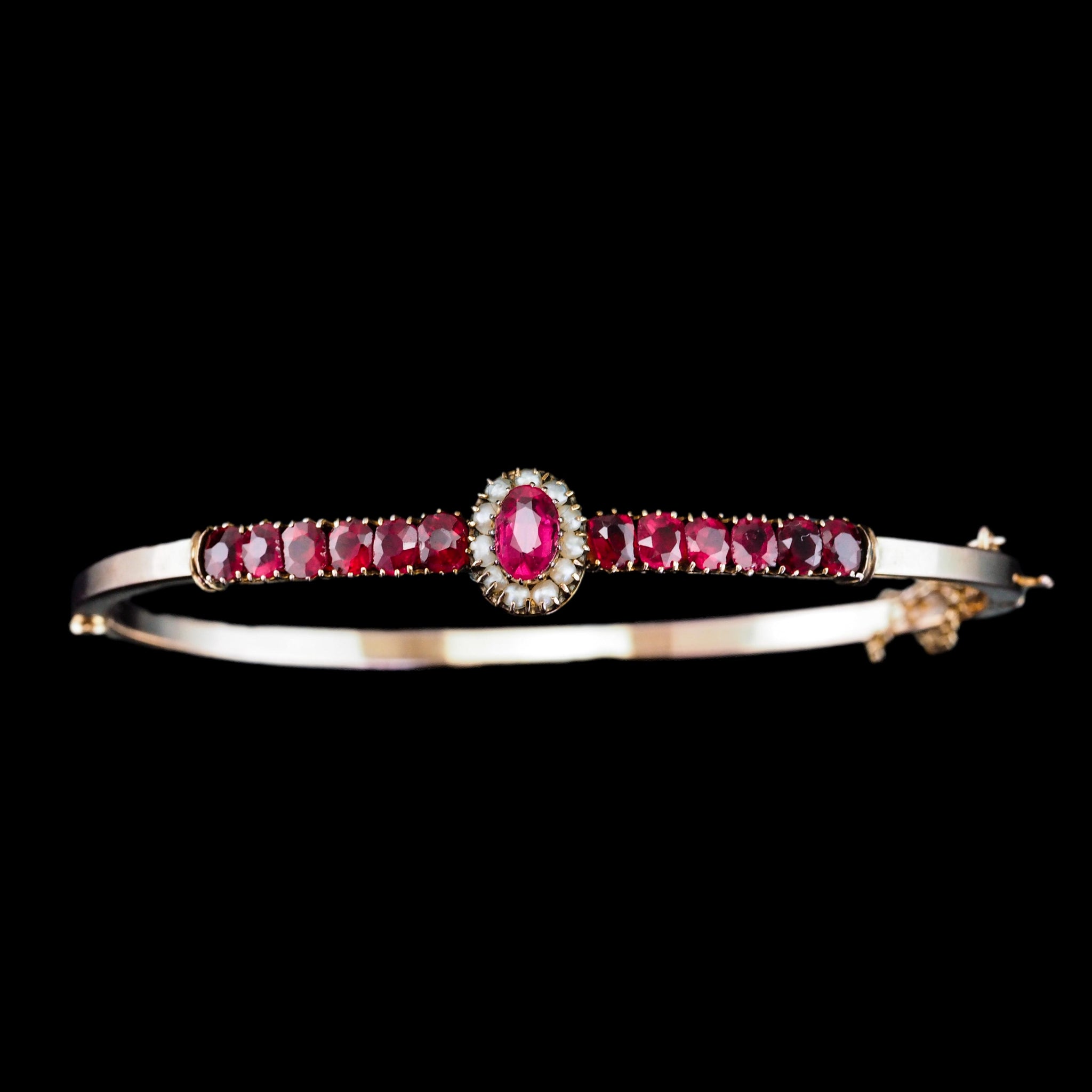 The bangle is made from solid antique 9ct gold and in spectacular fashion. Featuring a central cluster design and an ornate single row of pink garnet topped doublets (GTD) flanking, it presents a distinguished air full of vibrancy and charm.