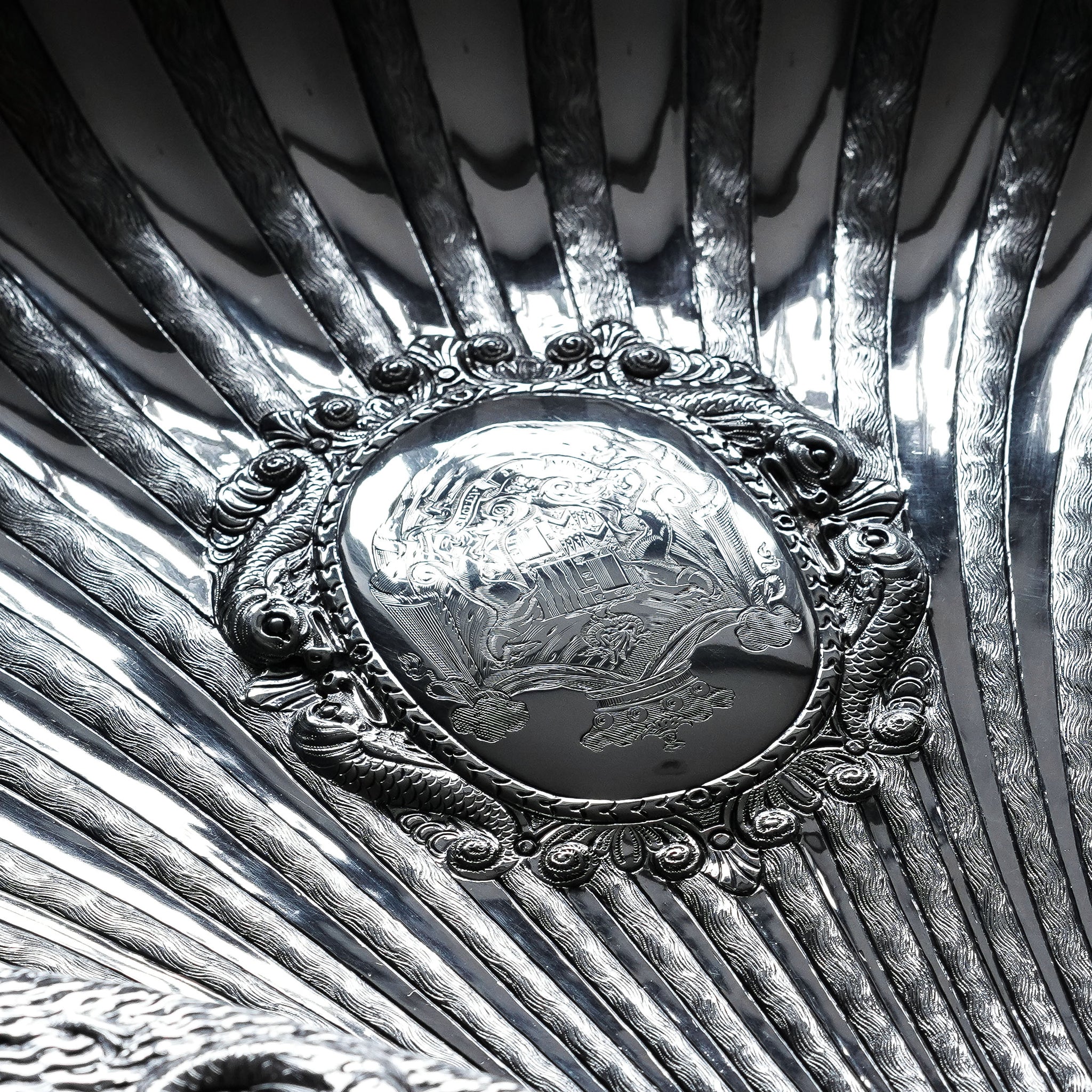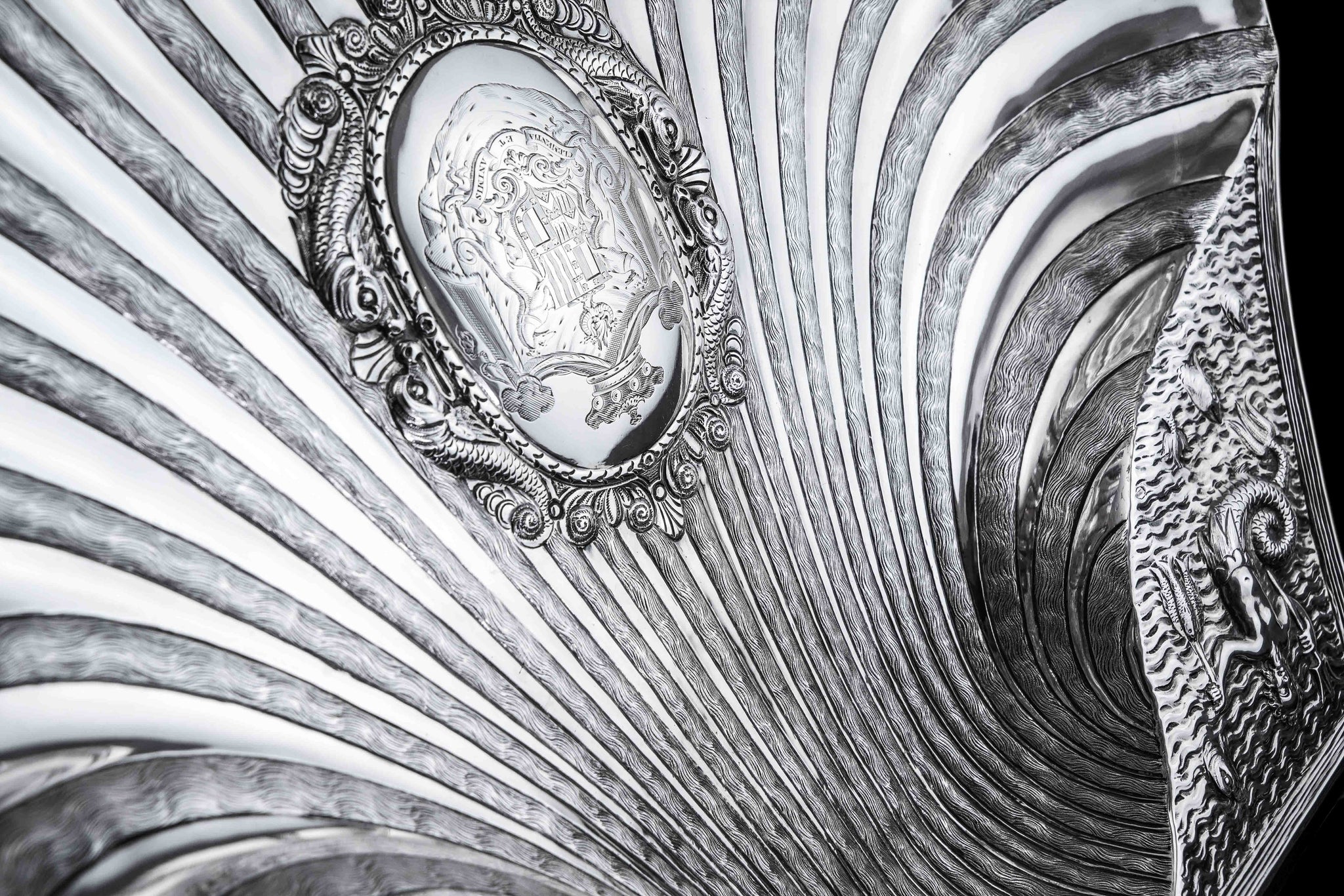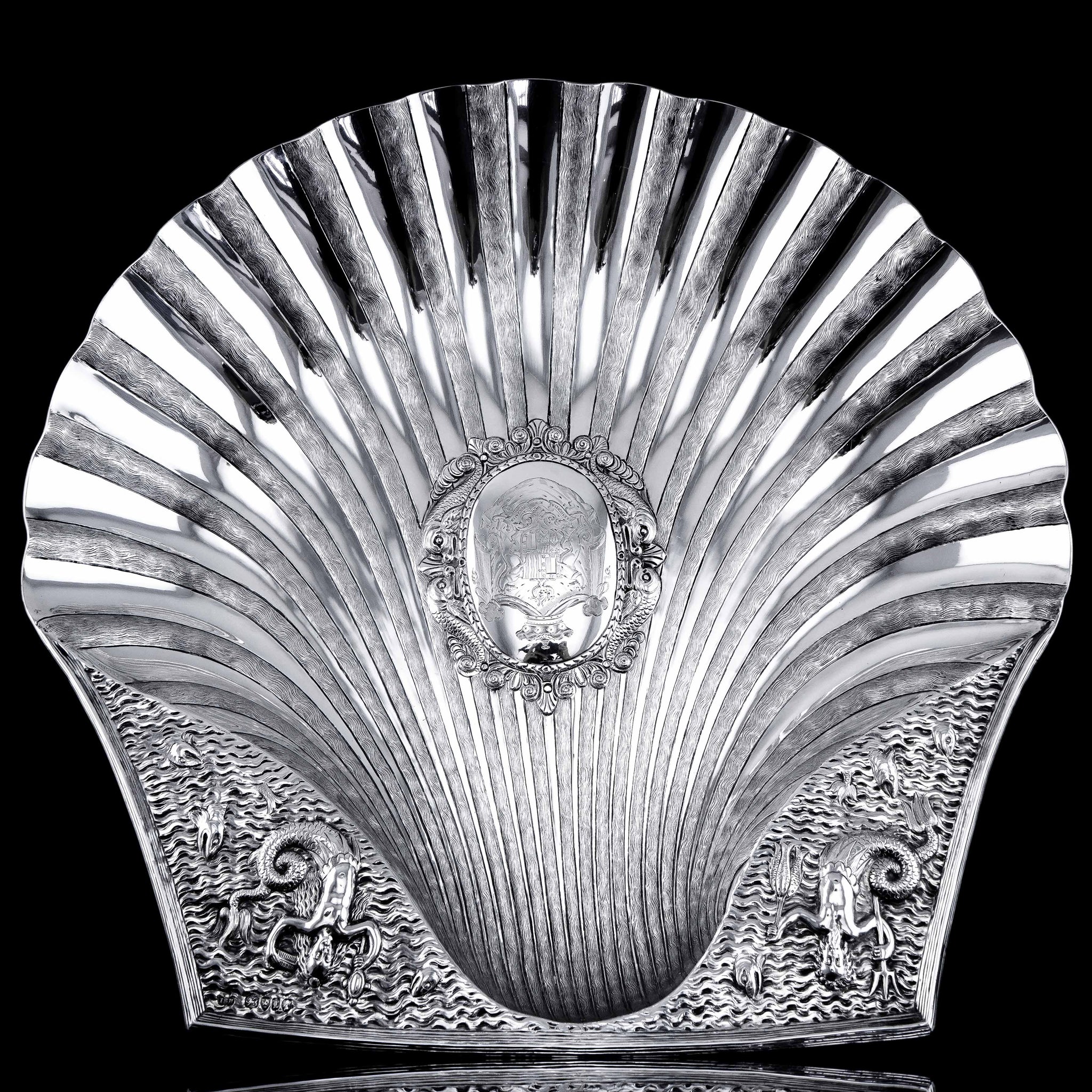 We are delighted to have acquired and offer this magnificent and substantial Victorian solid sterling silver shell basin, made by John Samuel Hunt (Hunt and Roskell), London, 1846.