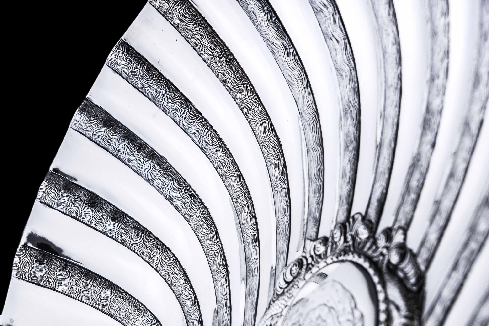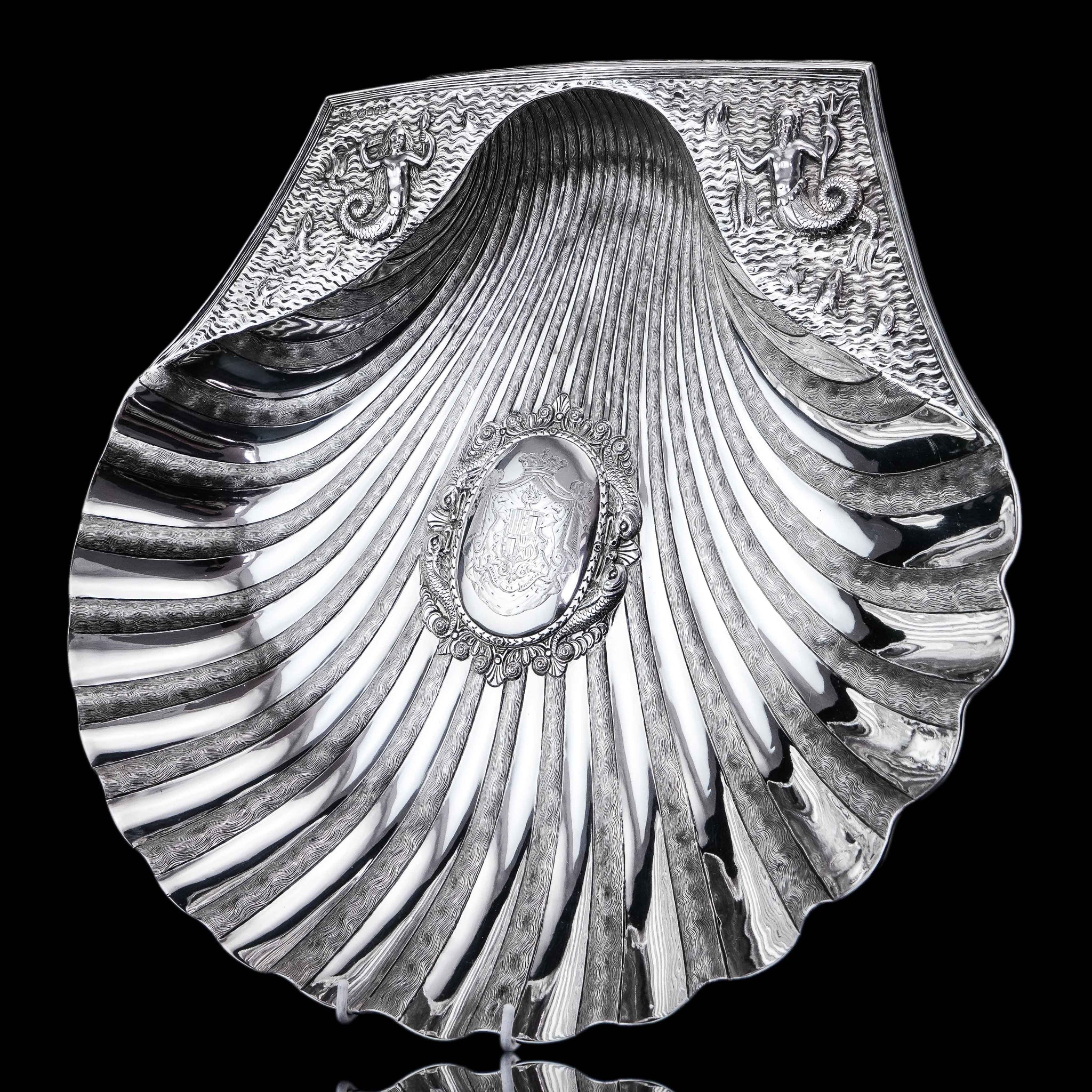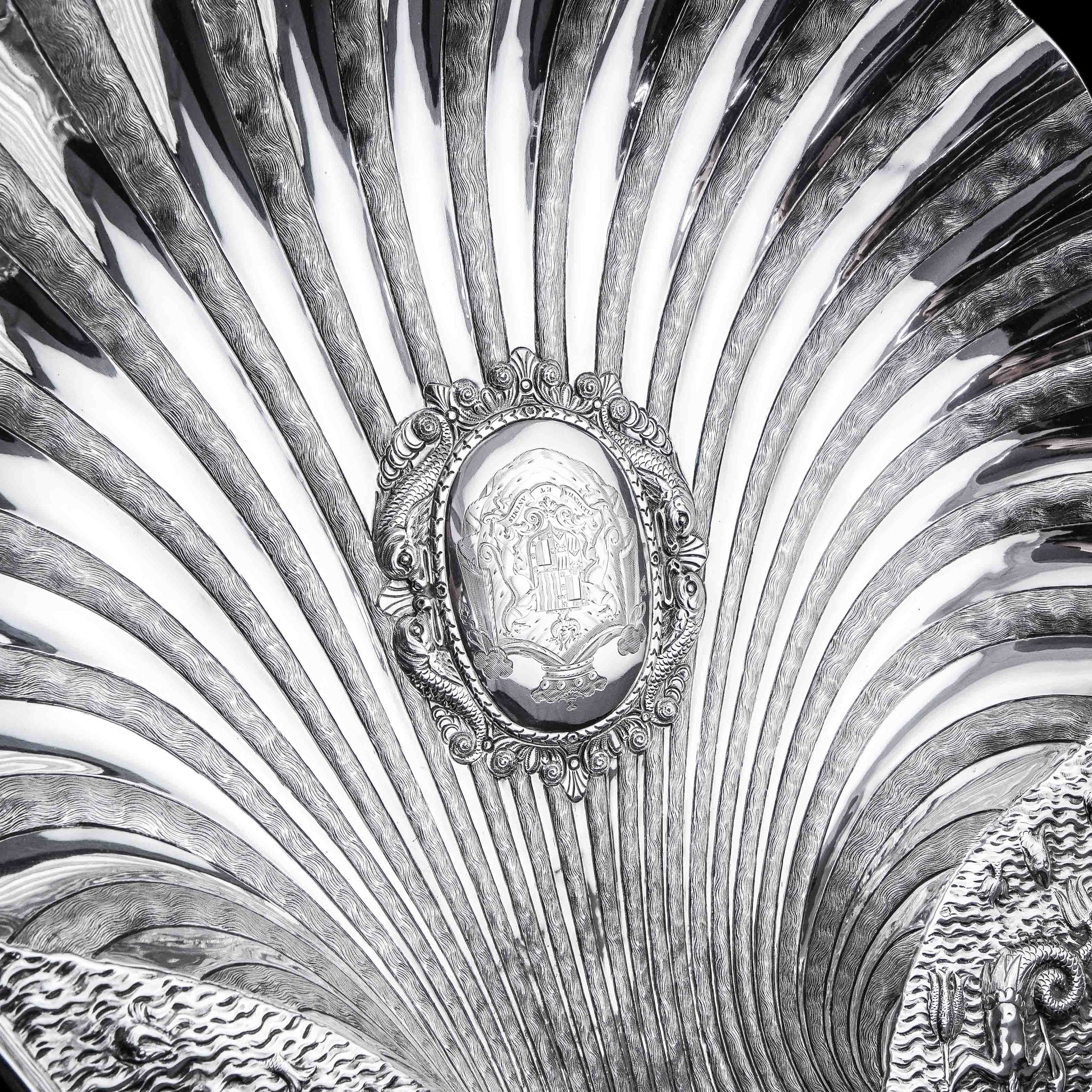 We are delighted to have acquired and offer this magnificent and substantial Victorian solid sterling silver shell basin, made by John Samuel Hunt (Hunt and Roskell), London, 1846.