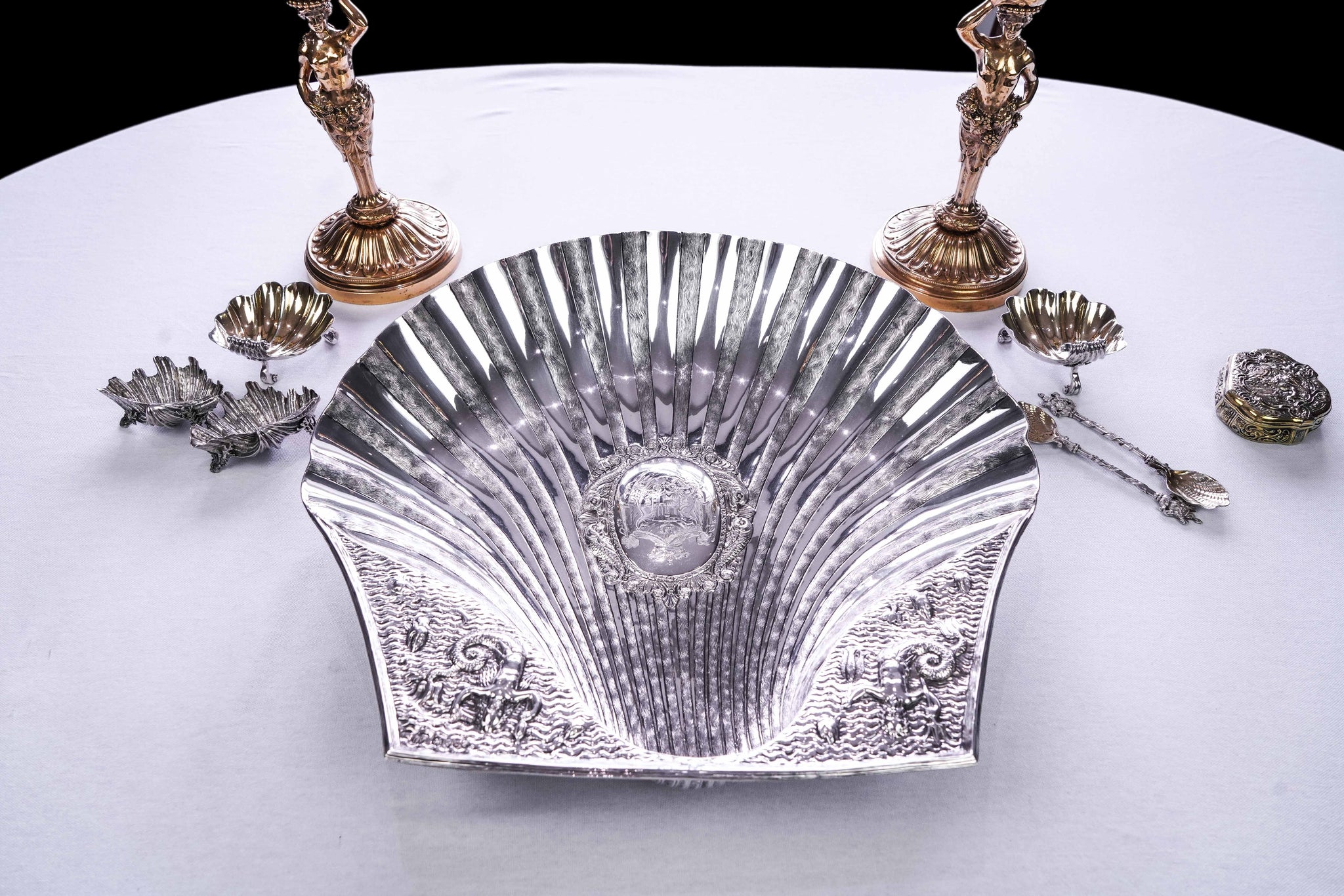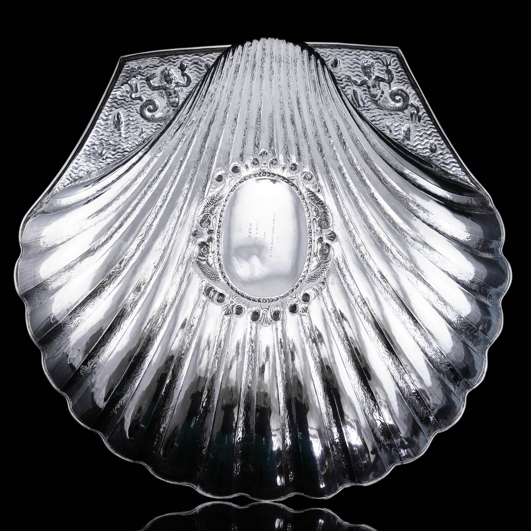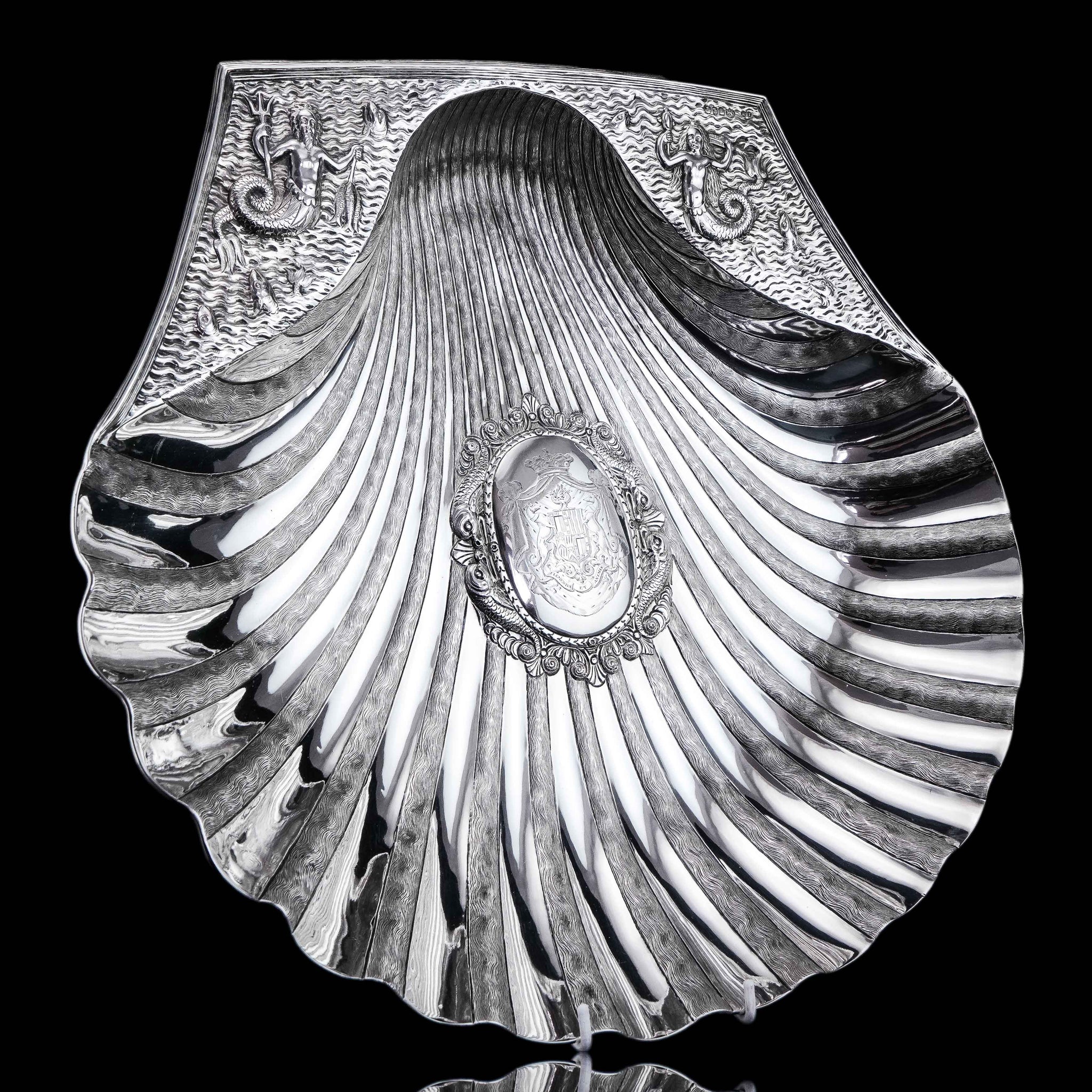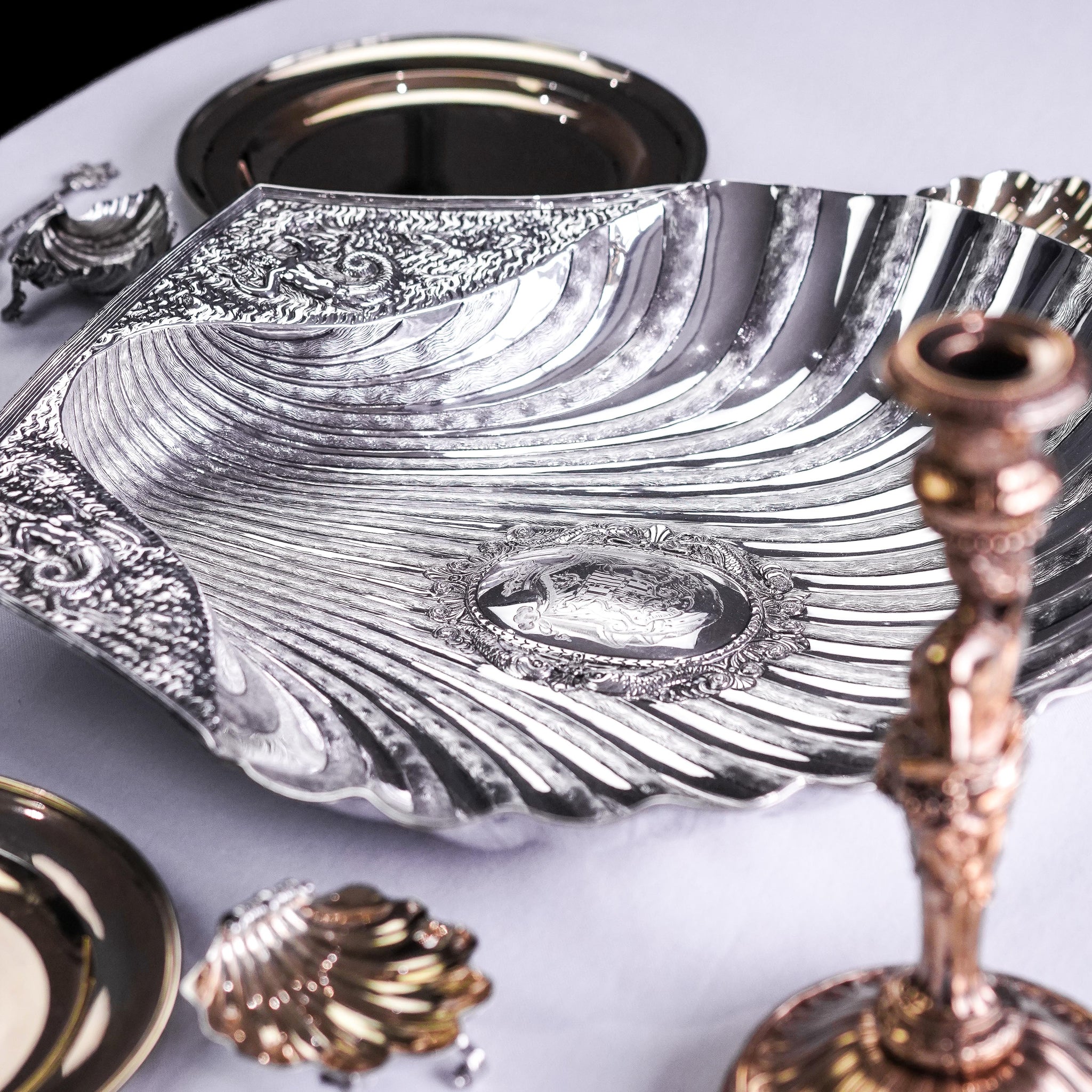 Needless to say, it is most certainly not your average shell dish (nor for butter!), as in fact, this piece was probably a bespoke commission in the Victorian period based on an earlier silver shell basin and ewer of the 17th century, which can be seen in the V&A Museum: https://collections.vam.ac.uk/item/O7763/the-mermaid-ewer-and-basin-ewer-and-basin-unknown/