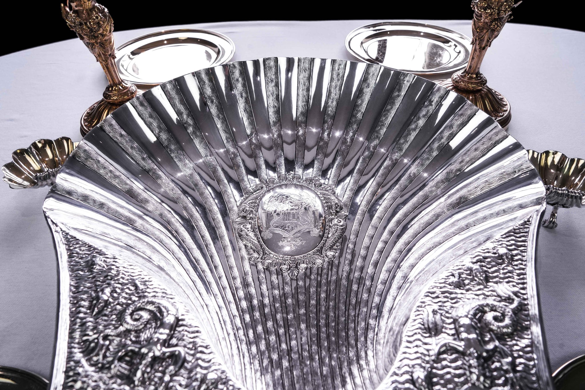 Stunning in size, spectacularly designed and sensational in silver artistry, this piece presents a tremendous and lasting impression. Crafted by the pre-eminent silversmiths of the 19th century, John Samuel Hunt (Hunt and Roskell - Royal Gold/Silversmiths, founded by Paul Storr), it comes as no surprise that it displays some of the most impressive and fine silversmithing of the Victorian period.