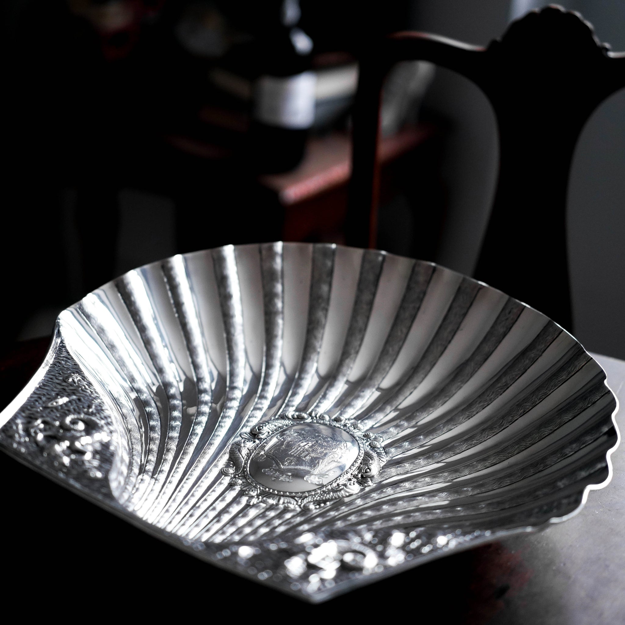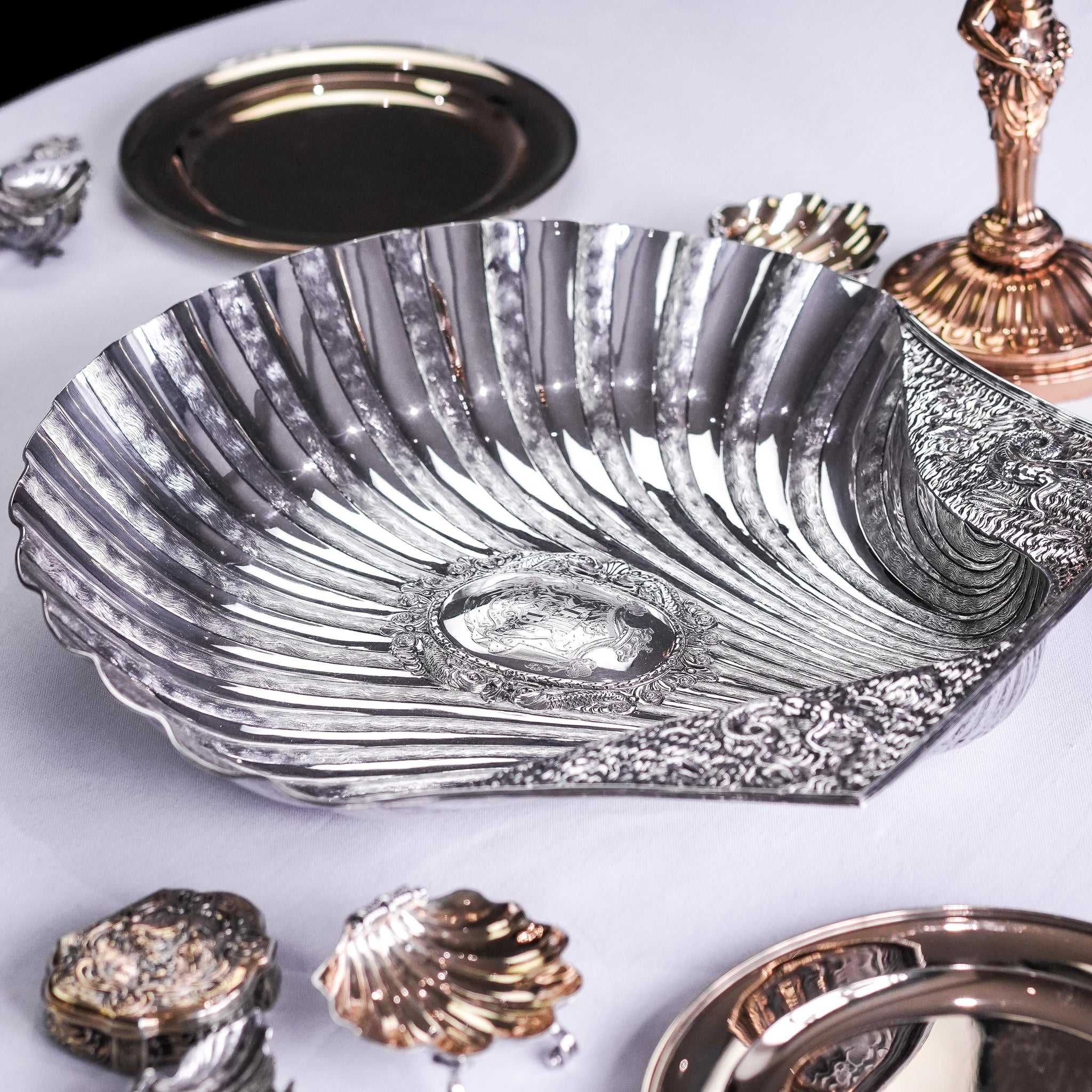 Whilst typically silver shell dishes, be it butter or salt dishes are around 8-10cm, this silver shell measures over 40cm+ and weighs over 1.2kg of pure sterling silver, which is a feat in itself, but also is thought-provoking regarding the status and character of the owner who would have possessed this piece.