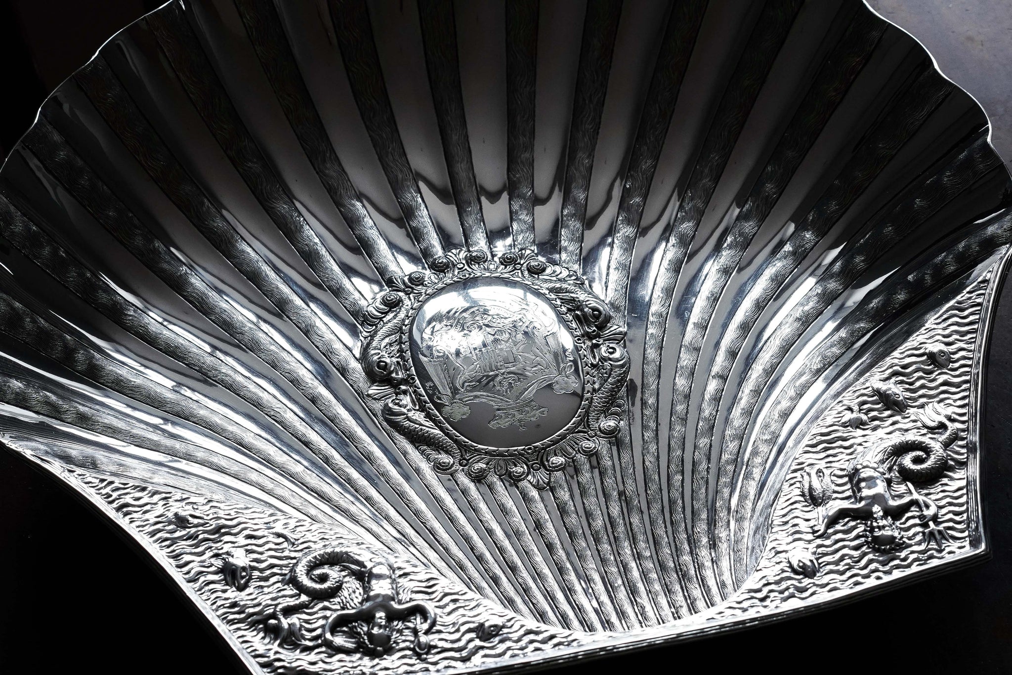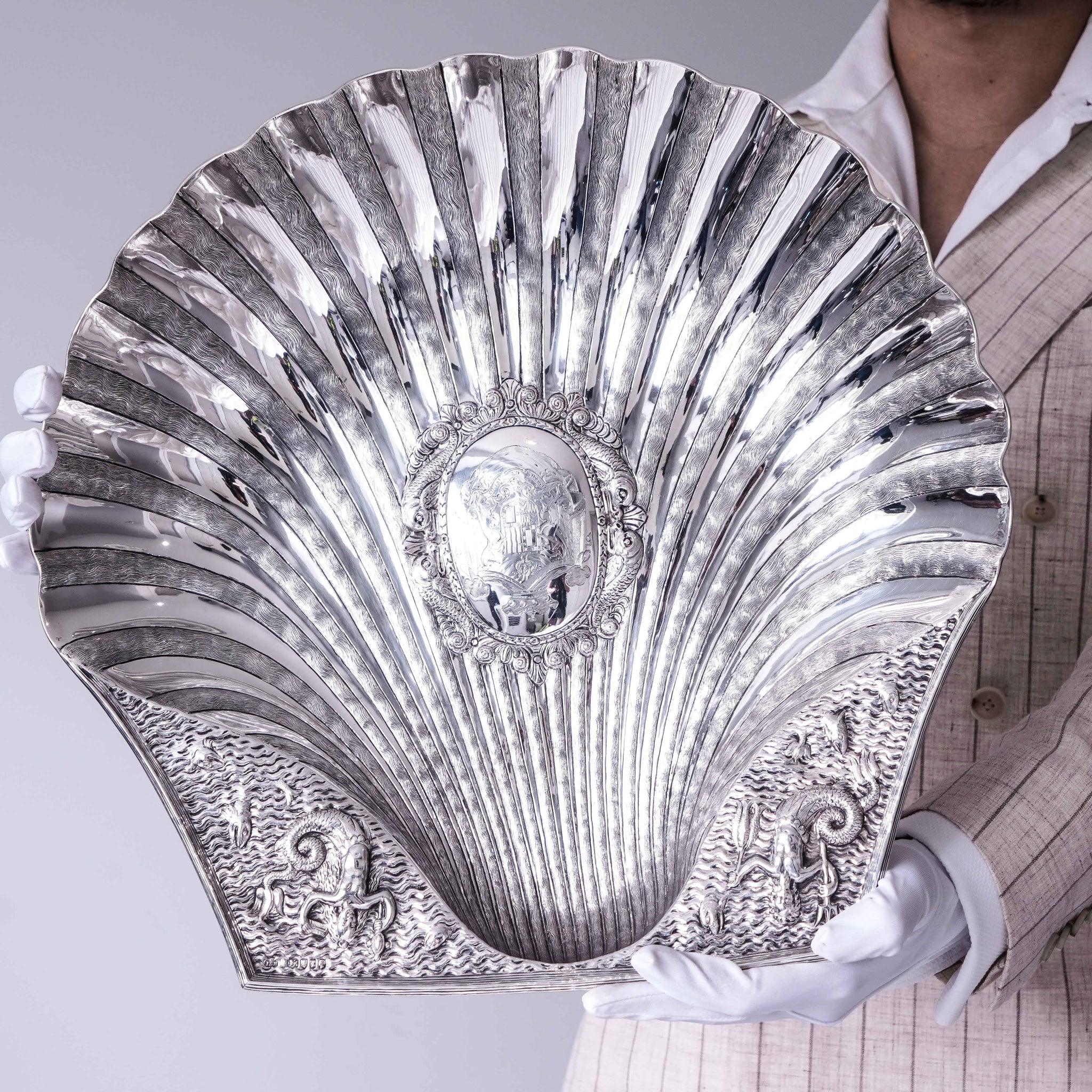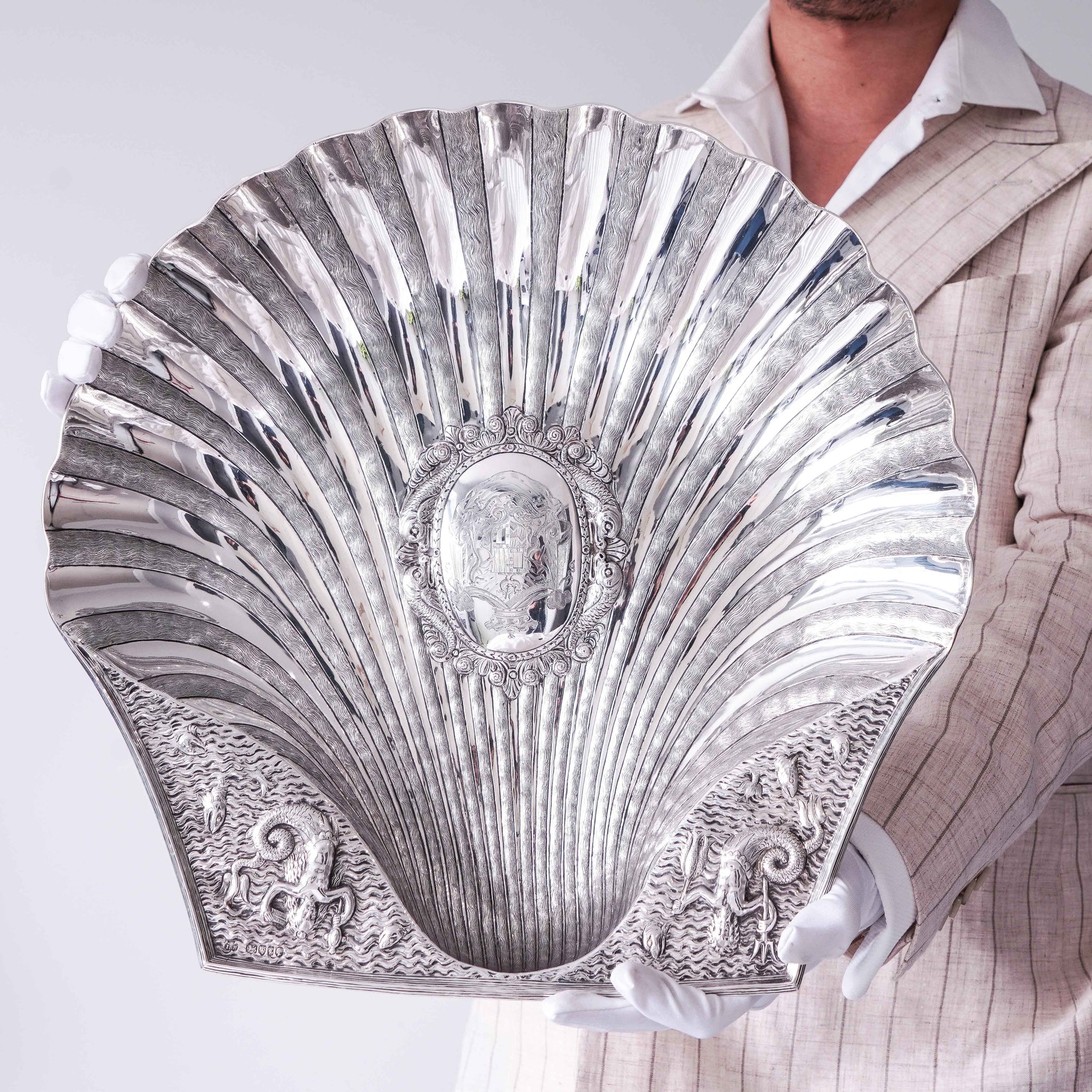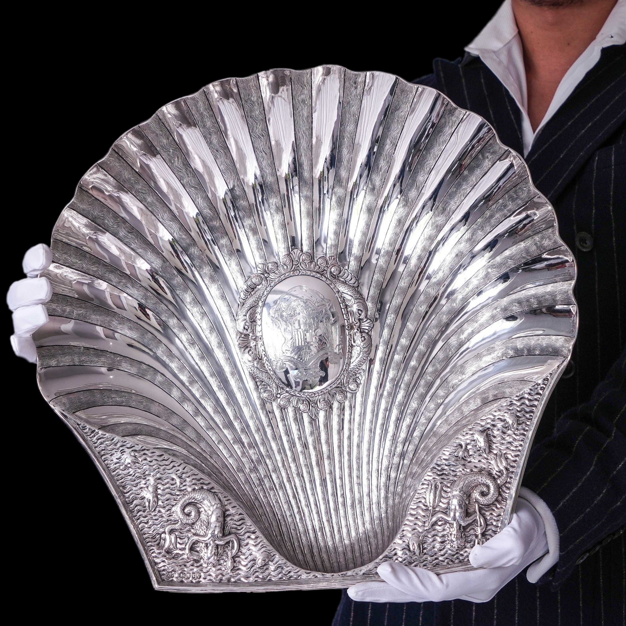 • Load image into Gallery viewer, A Spectacular & Huge Antique Victorian Solid Silver Shell Basin Dish / Bowl (40cm+) - Hunt & Roskell, London 1846