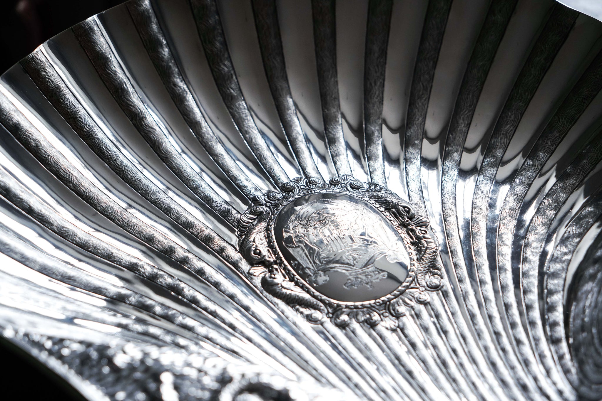 Better yet, upon closer examination, one can truly appreciate its intricacy and craftsmanship. In spite of its bold size, the decoration and embellishments are very fine and detailed whilst retaining and paying homage to the 17th-century style and charm. The top portion features a hand-chased and embossed effect of waves and two mythological figures. The basin features a two-texture motif where each groove features a plain finish, followed by a finely engraved and matted texture that creates a beautiful contrast and highlights its scalloped features.