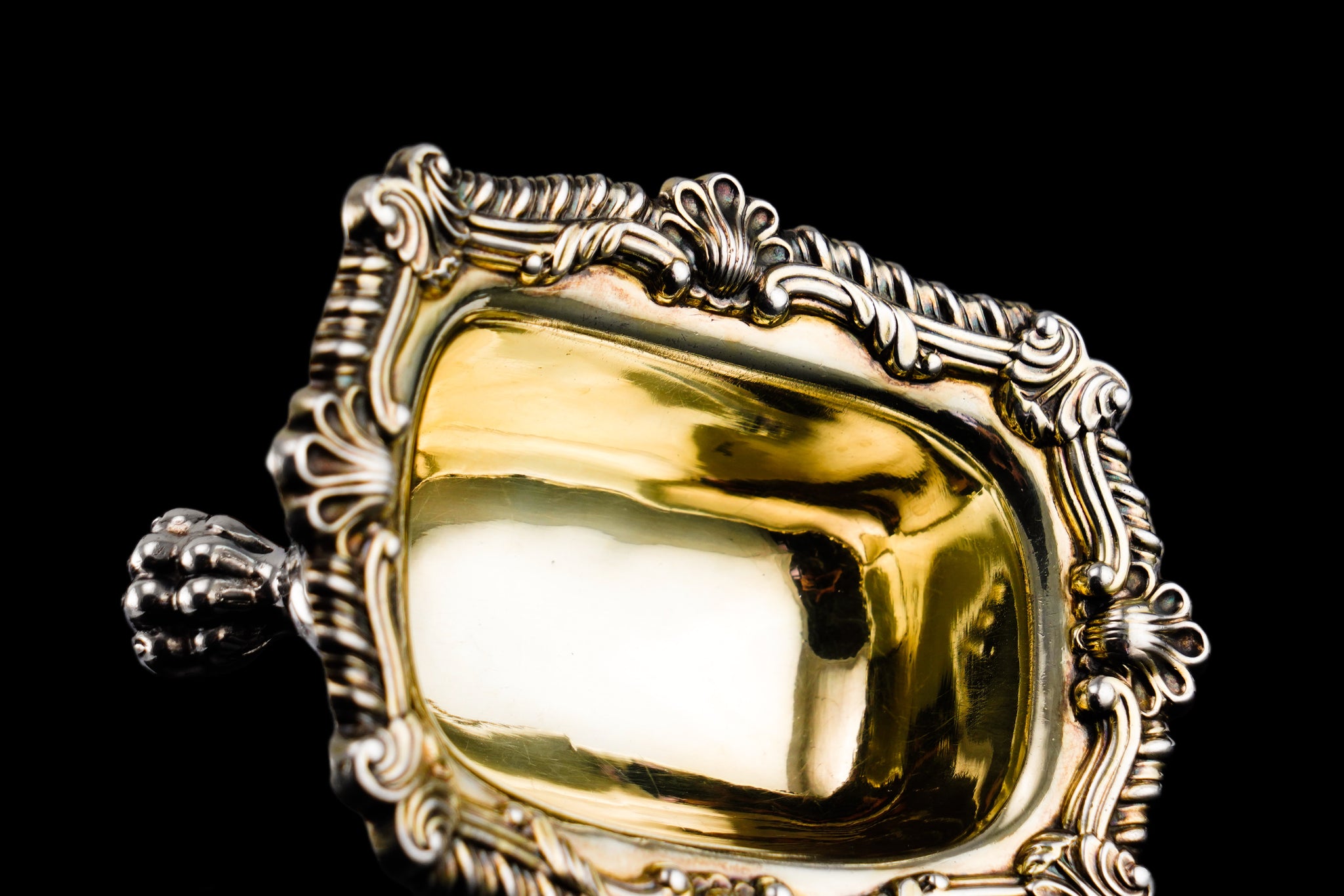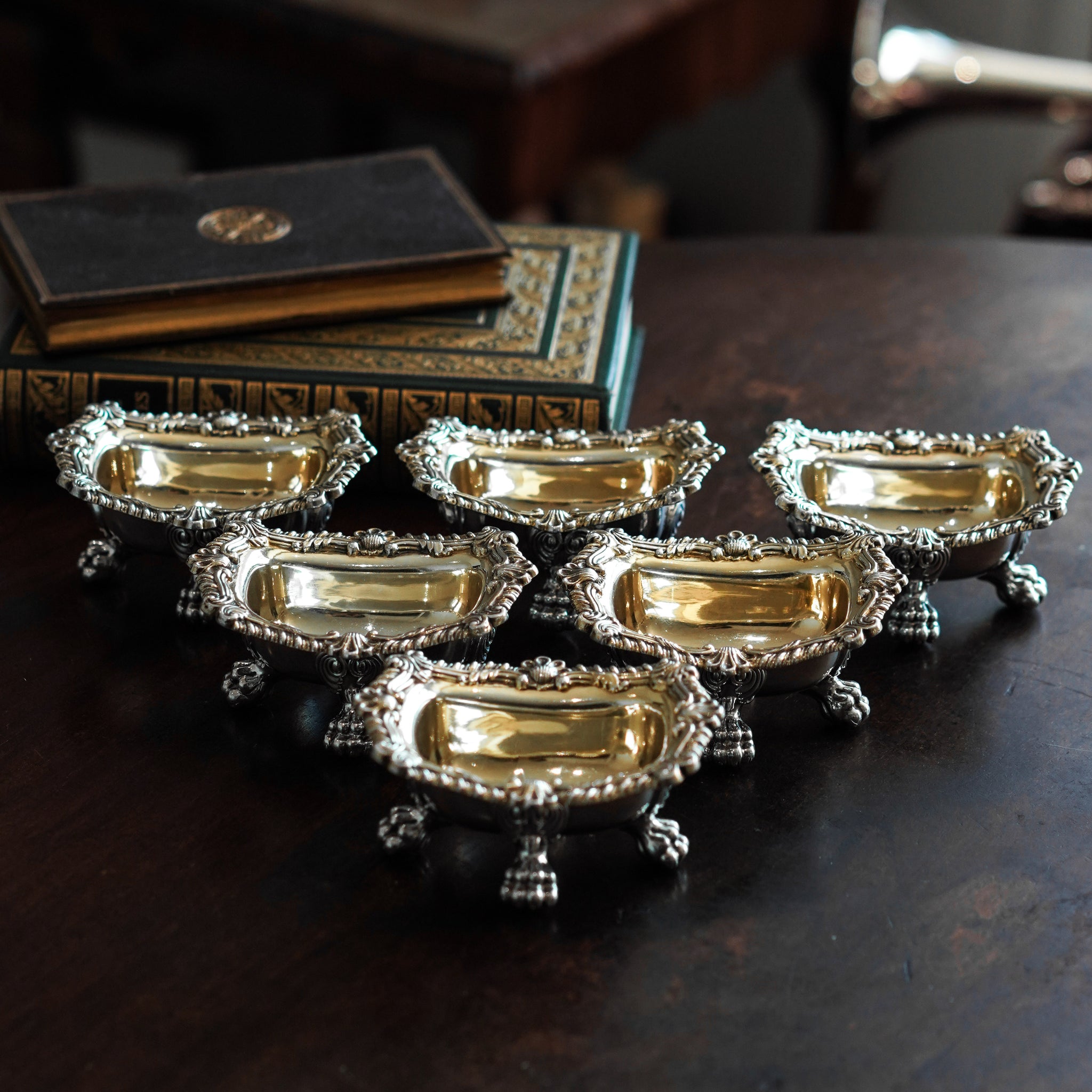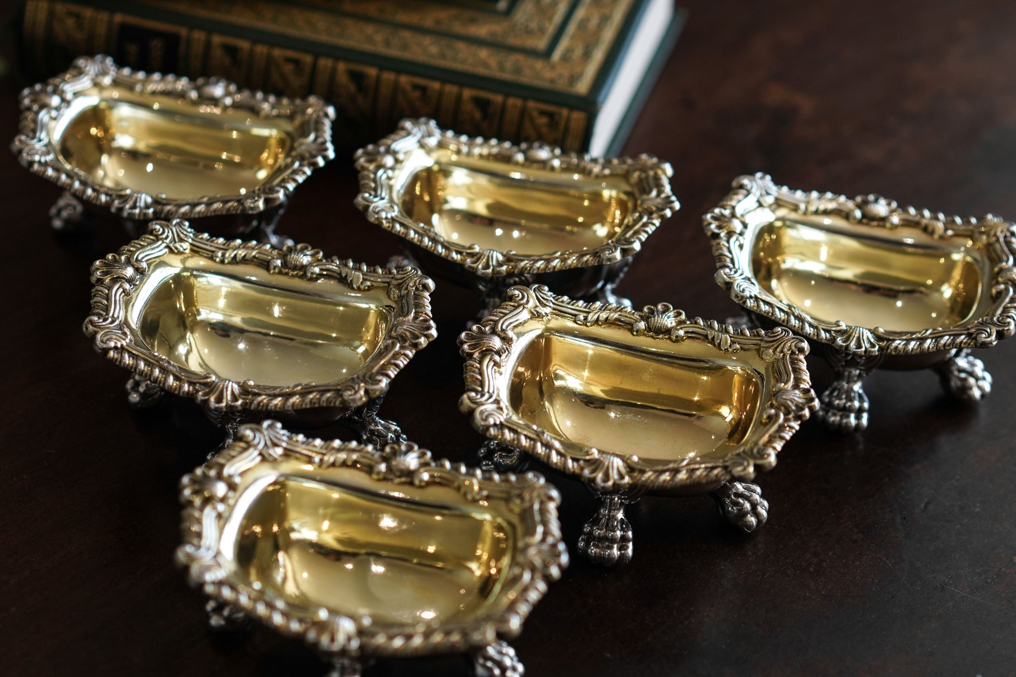 Delightful as it already is to find a set of 6 intact througout the ages, additionally, these salts have remained in great order and their original gilding remains with a beautiful antique yellow/lemon gold gilt tone. The gilding not only provides a lovely contrast to the silver tone but also serves a practical purpose in protecting the silver from reacting with the salt that would be placed within.