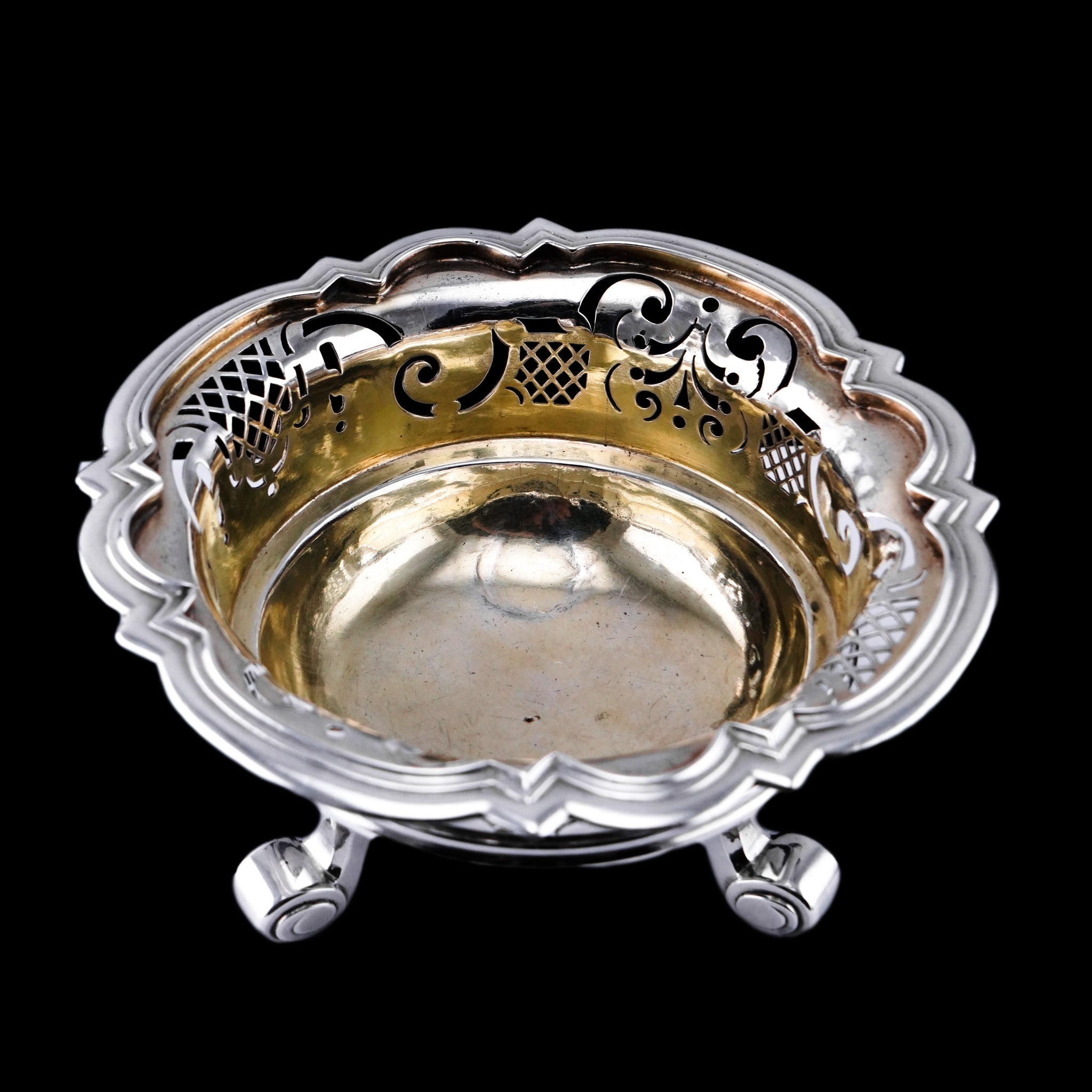 The bowl is raised on three very sturdy scrolled feet and features a wonderful gallery of pierced motifs. The piercing has been hand-finished and is a testament to its fine craftsmanship and labourious efforts that would have gone into making a single piece. The top section features a beautiful quatrefoil-like design with borders of multiple heights.