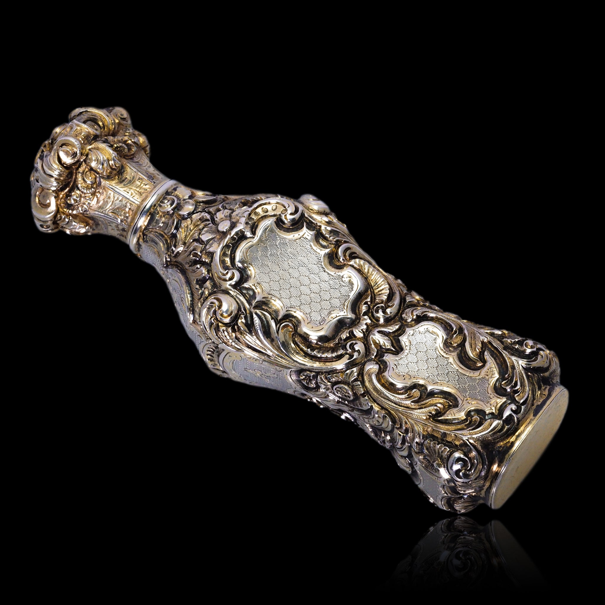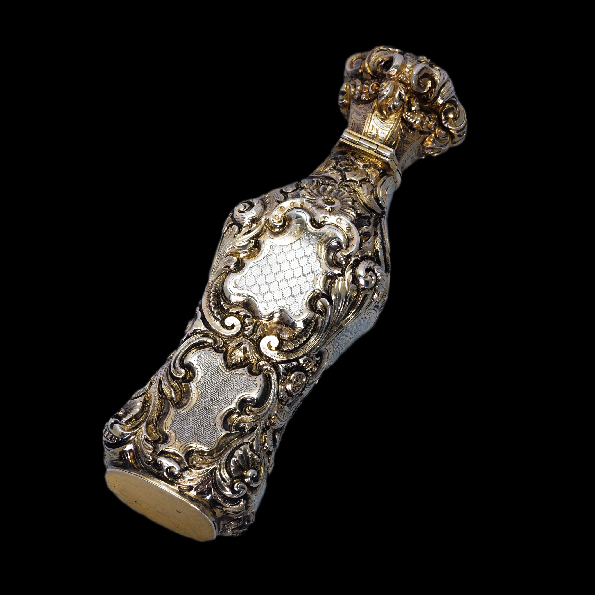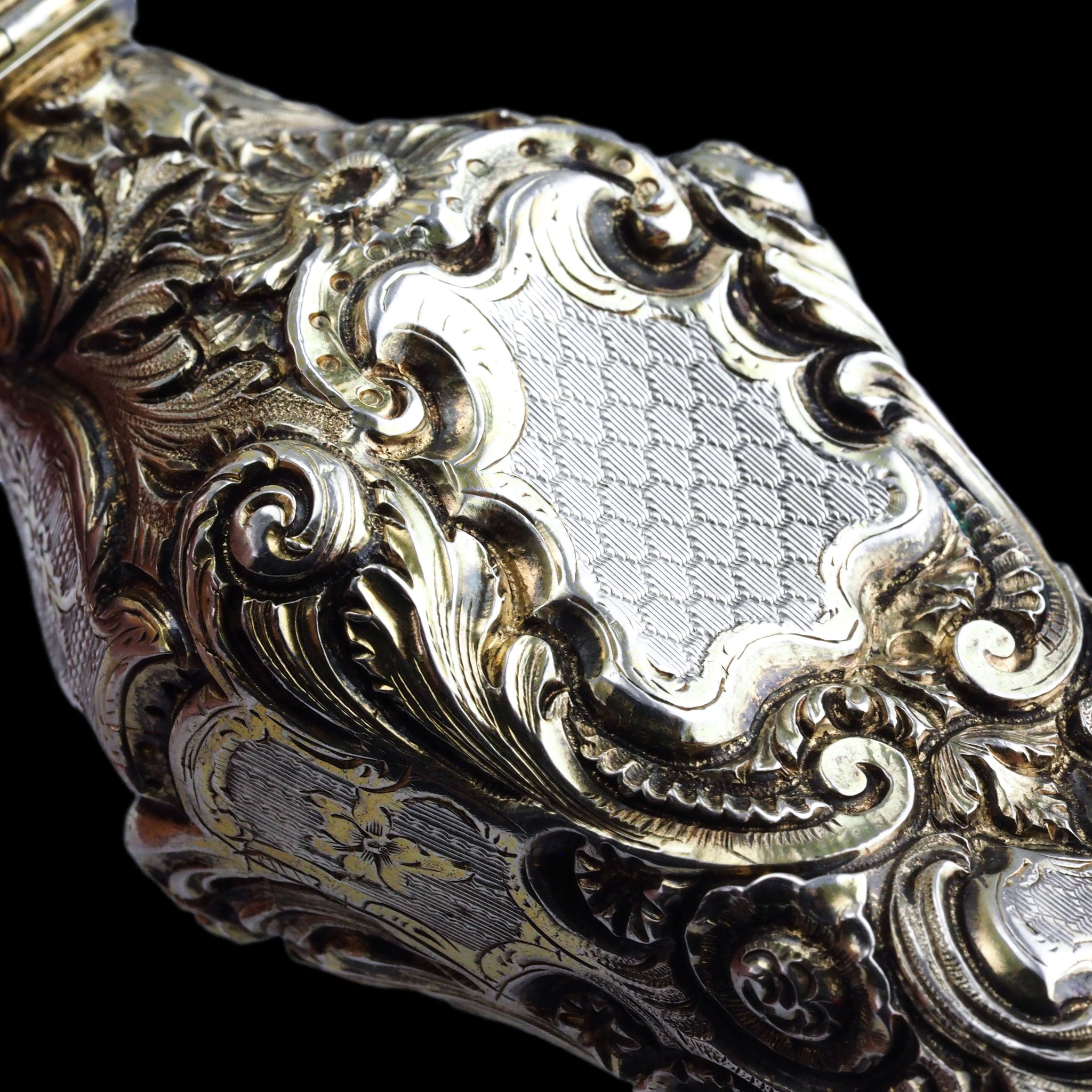Its entirety has been marvellously embellished with ornate scrolled foliate motifs that have been hand-chased and engraved. Parts which have been left without chasing form cartouches which have been intricated engine-turned (guilloché) with a wonderful honeycomb pattern. Whilst it shows signs of surviving through the ages, a light parcel-gilt design remains with beautiful highlighting of certain areas in gold.