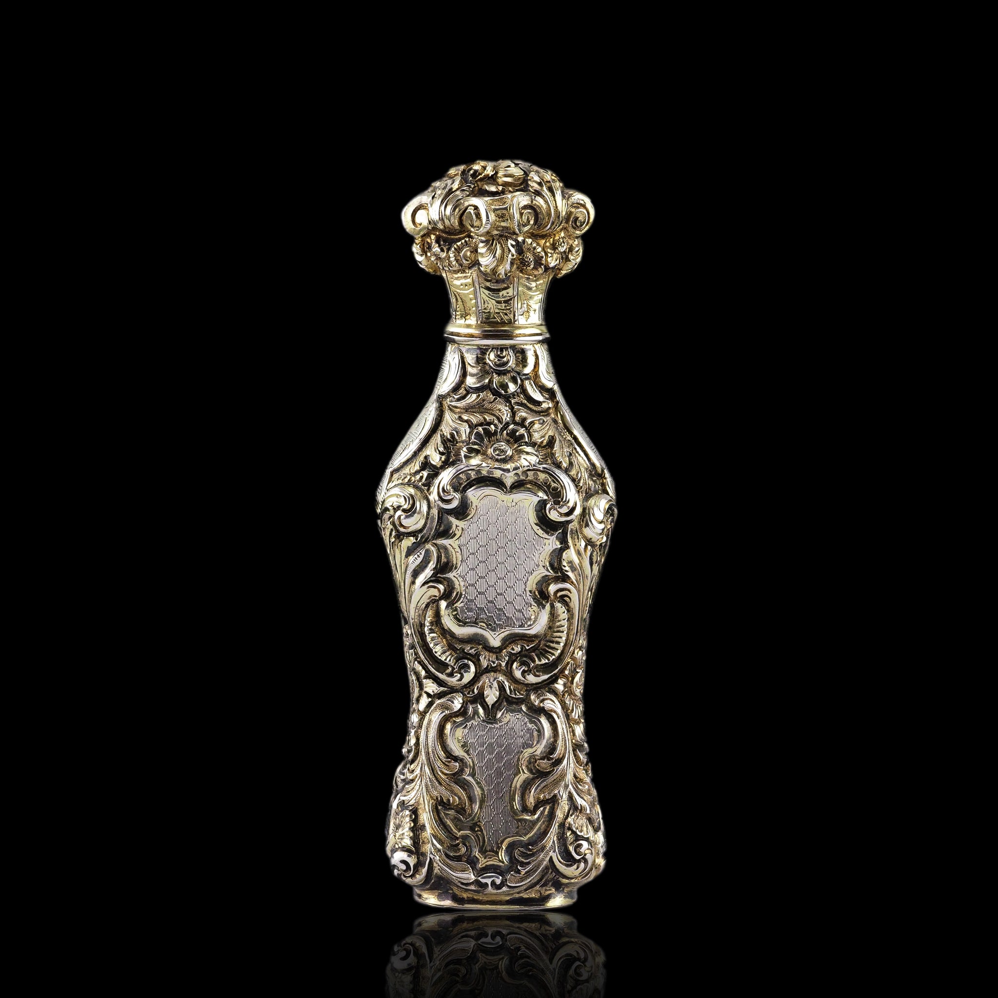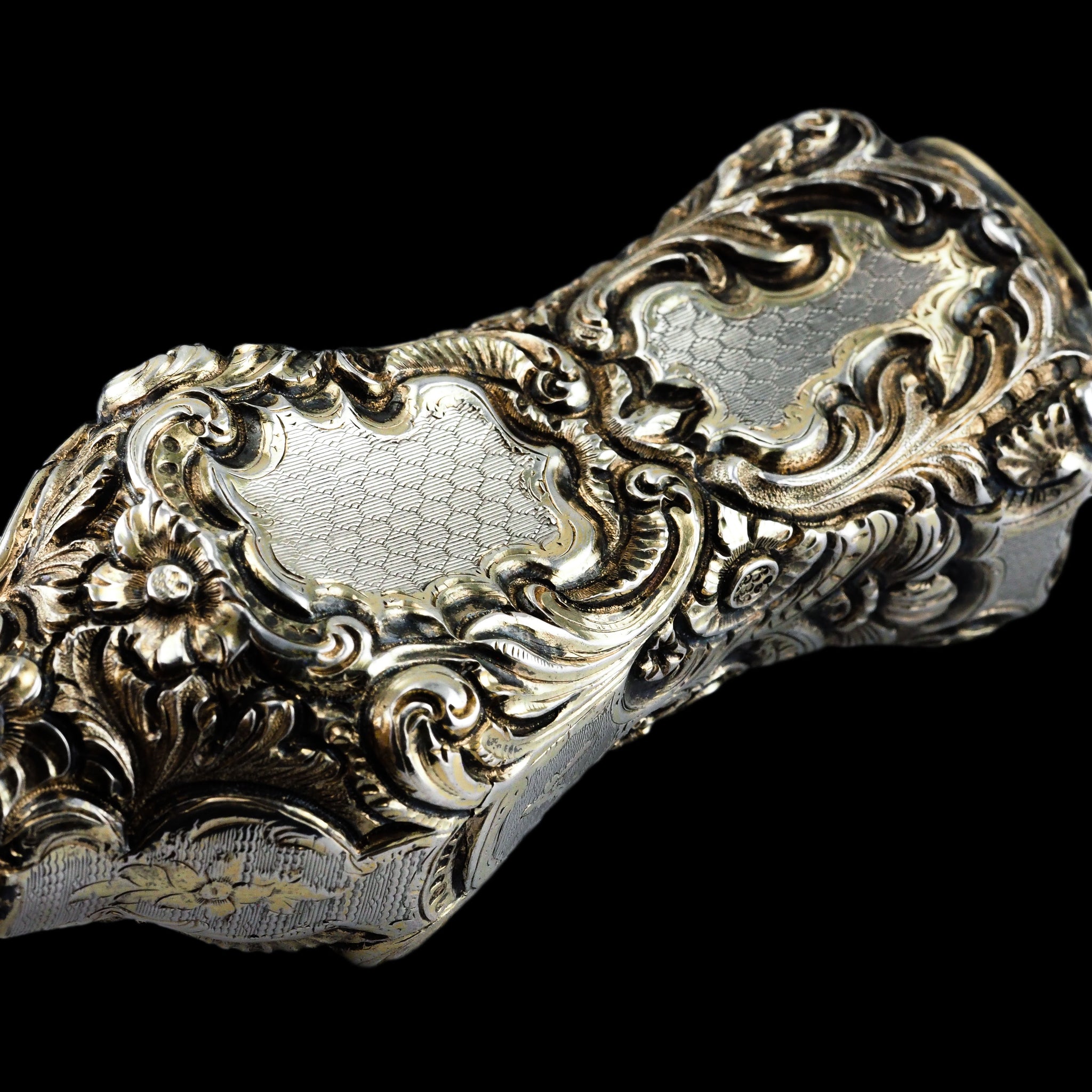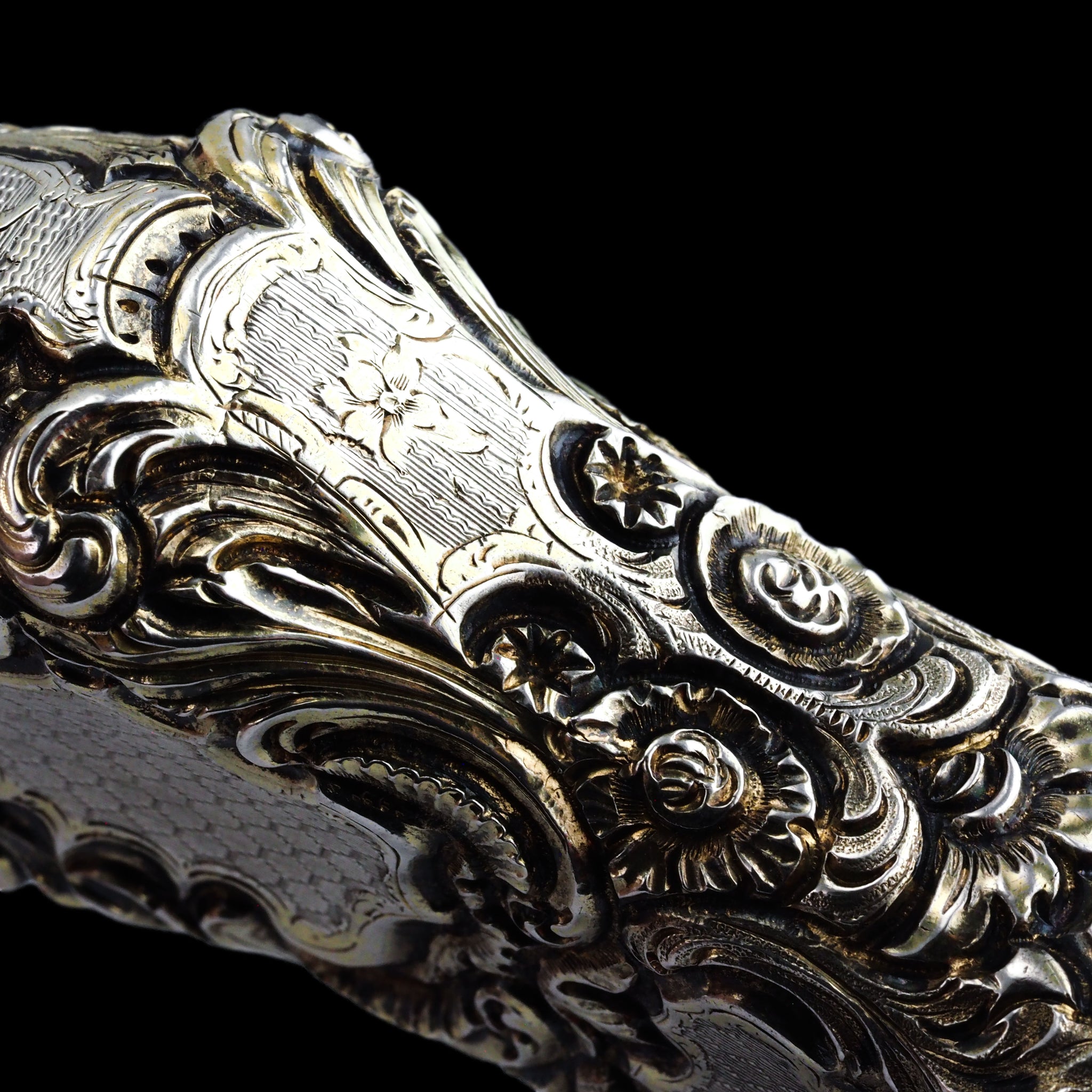 Its entirety has been marvellously embellished with ornate scrolled foliate motifs that have been hand-chased and engraved. Parts which have been left without chasing form cartouches which have been intricated engine-turned (guilloché) with a wonderful honeycomb pattern. Whilst it shows signs of surviving through the ages, a light parcel-gilt design remains with beautiful highlighting of certain areas in gold.
