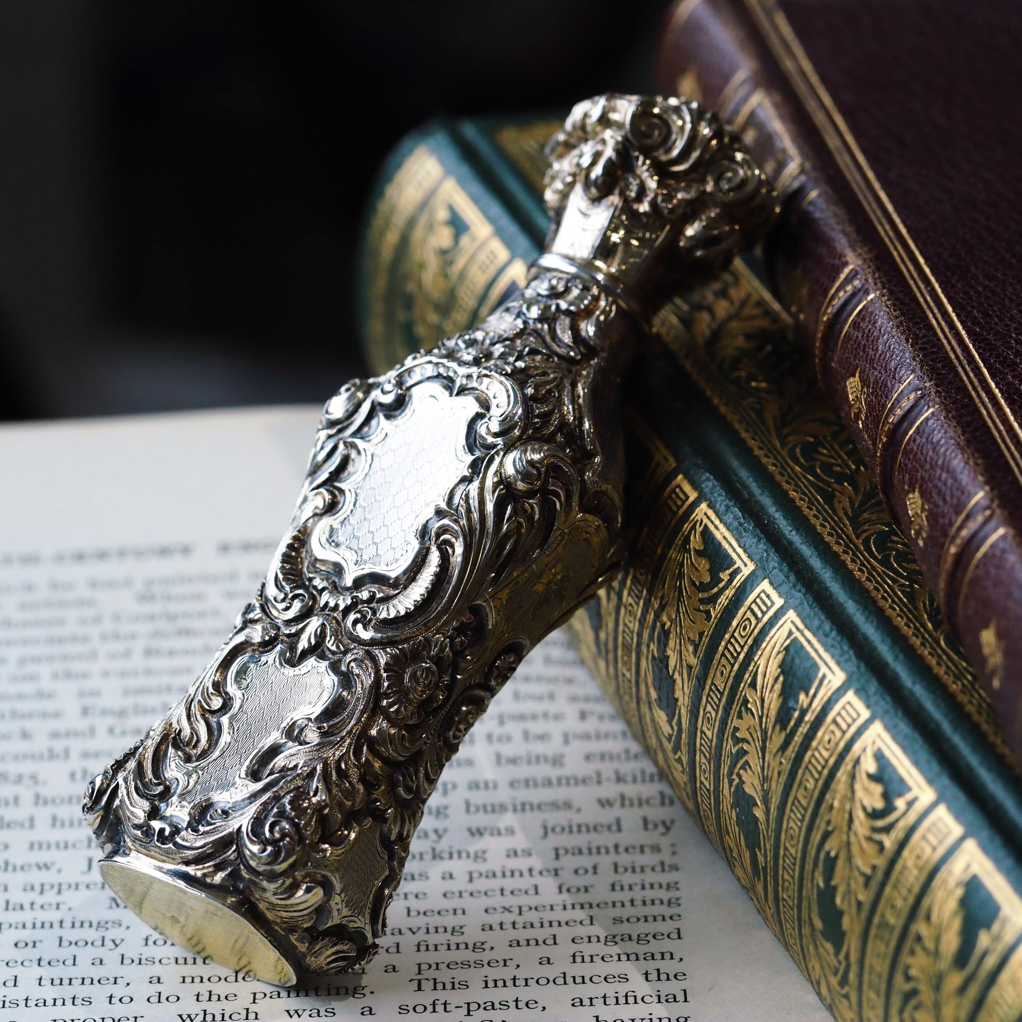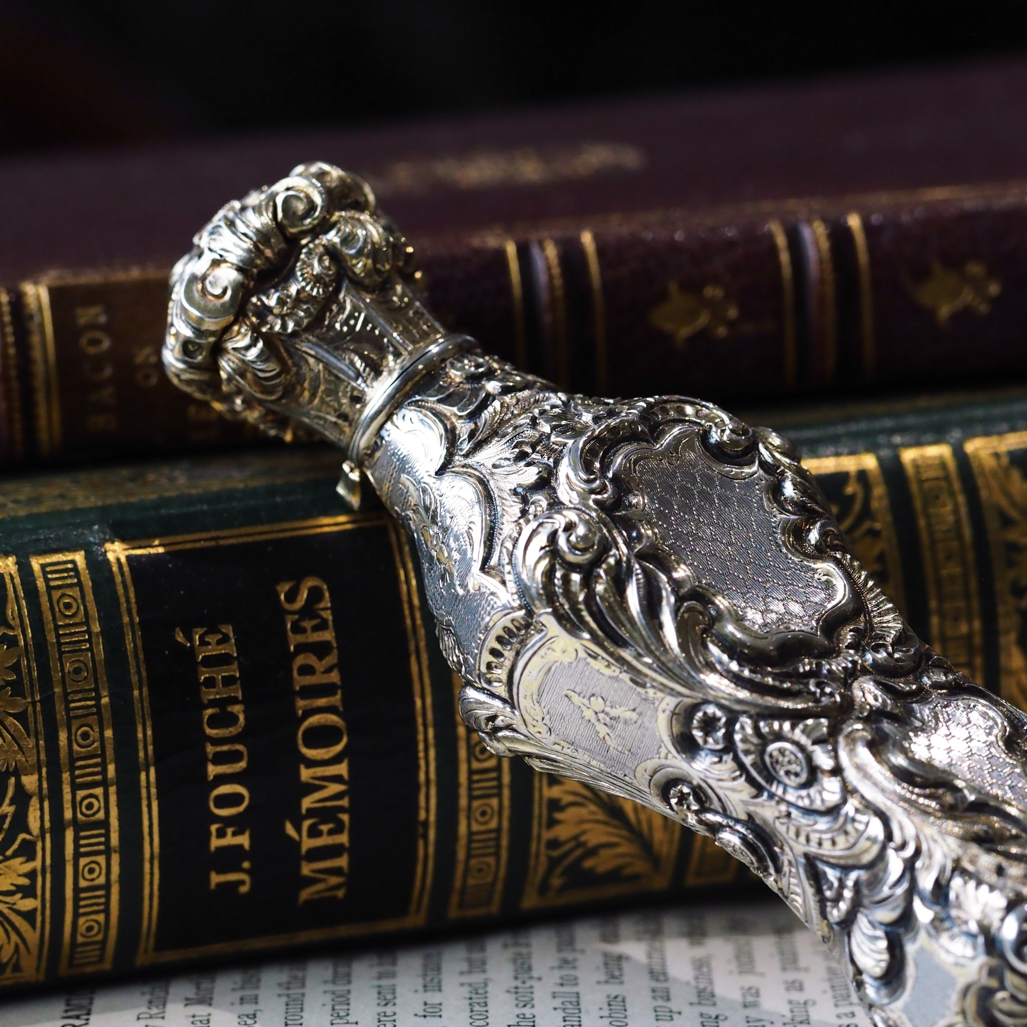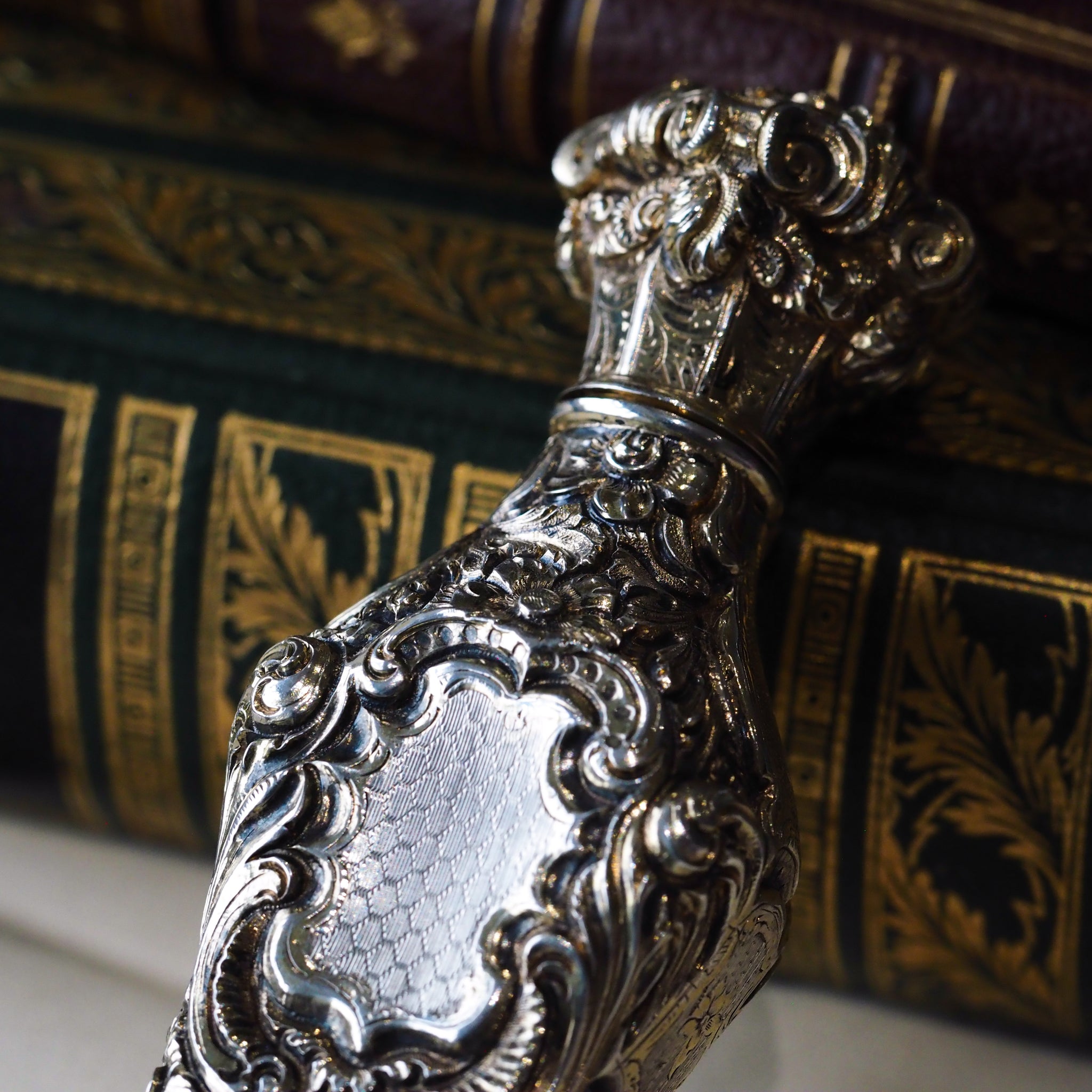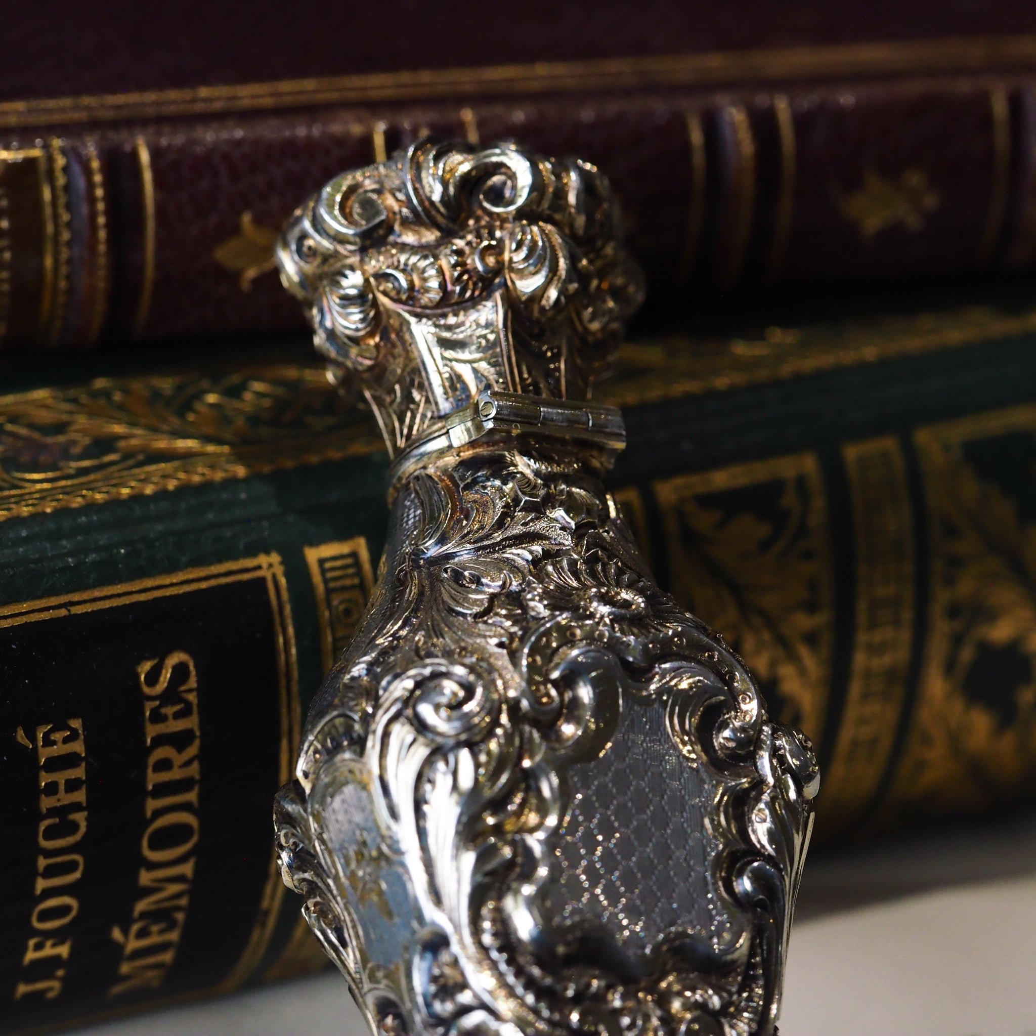 The bottle exudes opulence, splendour and the highest degree of artistry of fine silversmithing of the 19th century in one package. Upon holding it in hand, its solid gauge and quality can be appreciated with a very hefty and sturdy feel.
