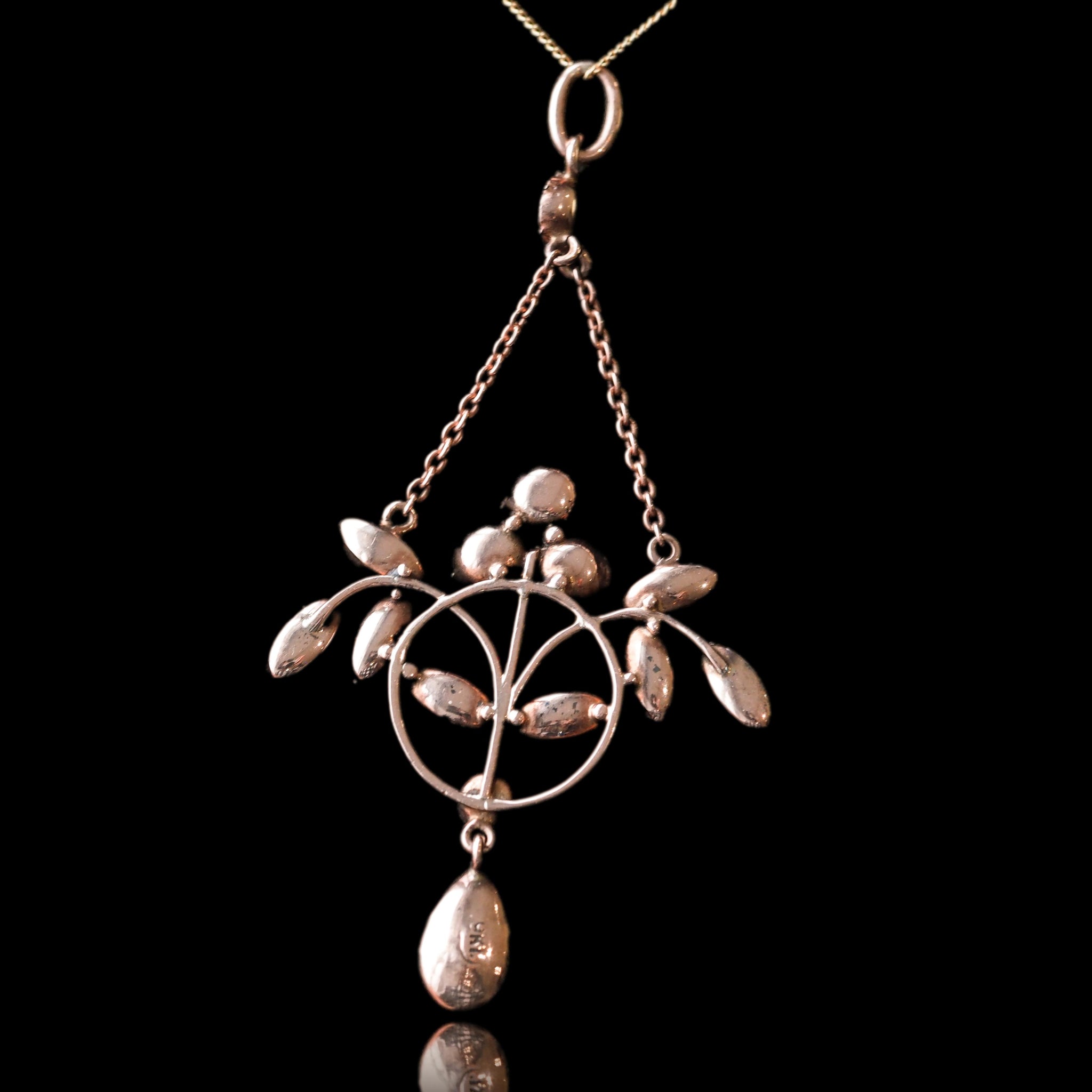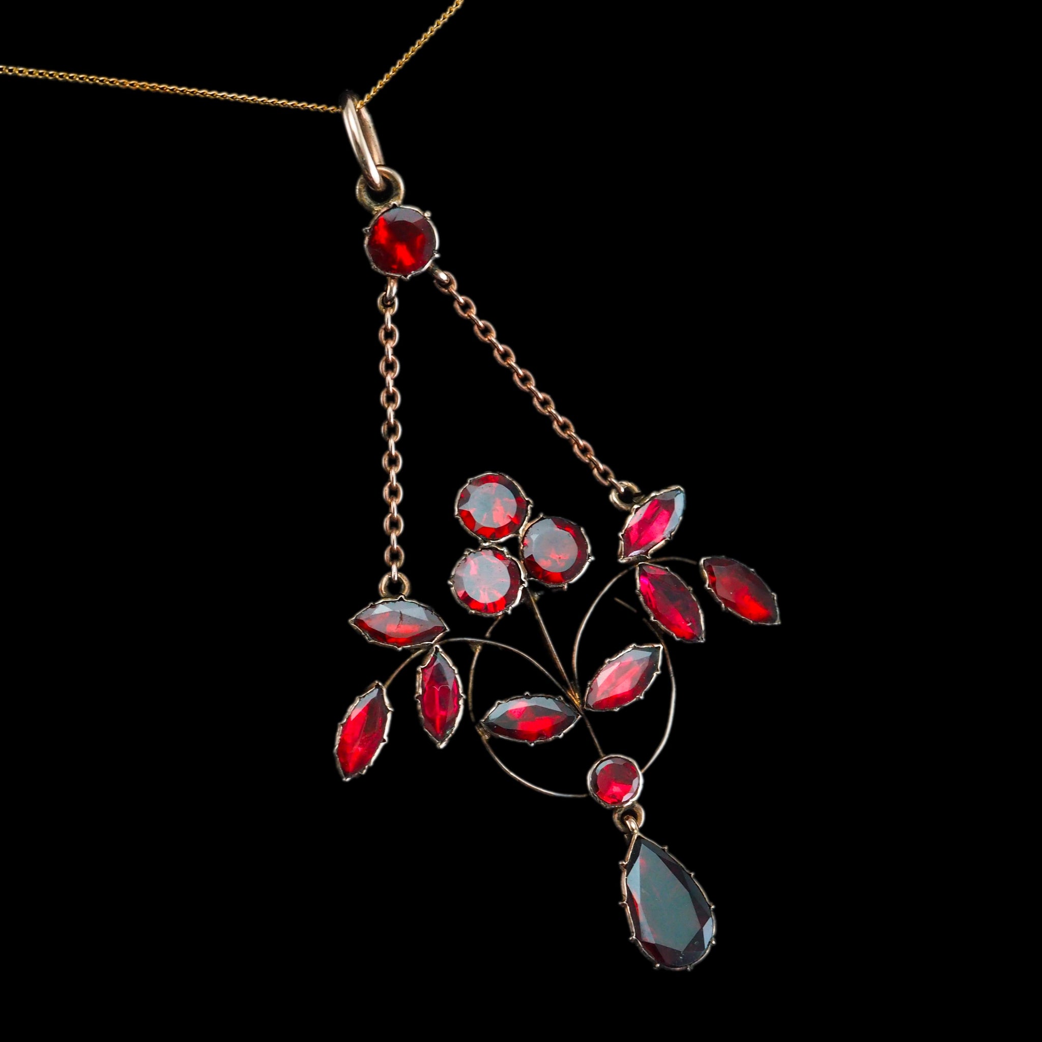 Antique Garnet Pendant Necklace 9K Gold Art Nouveau Design - c.1900