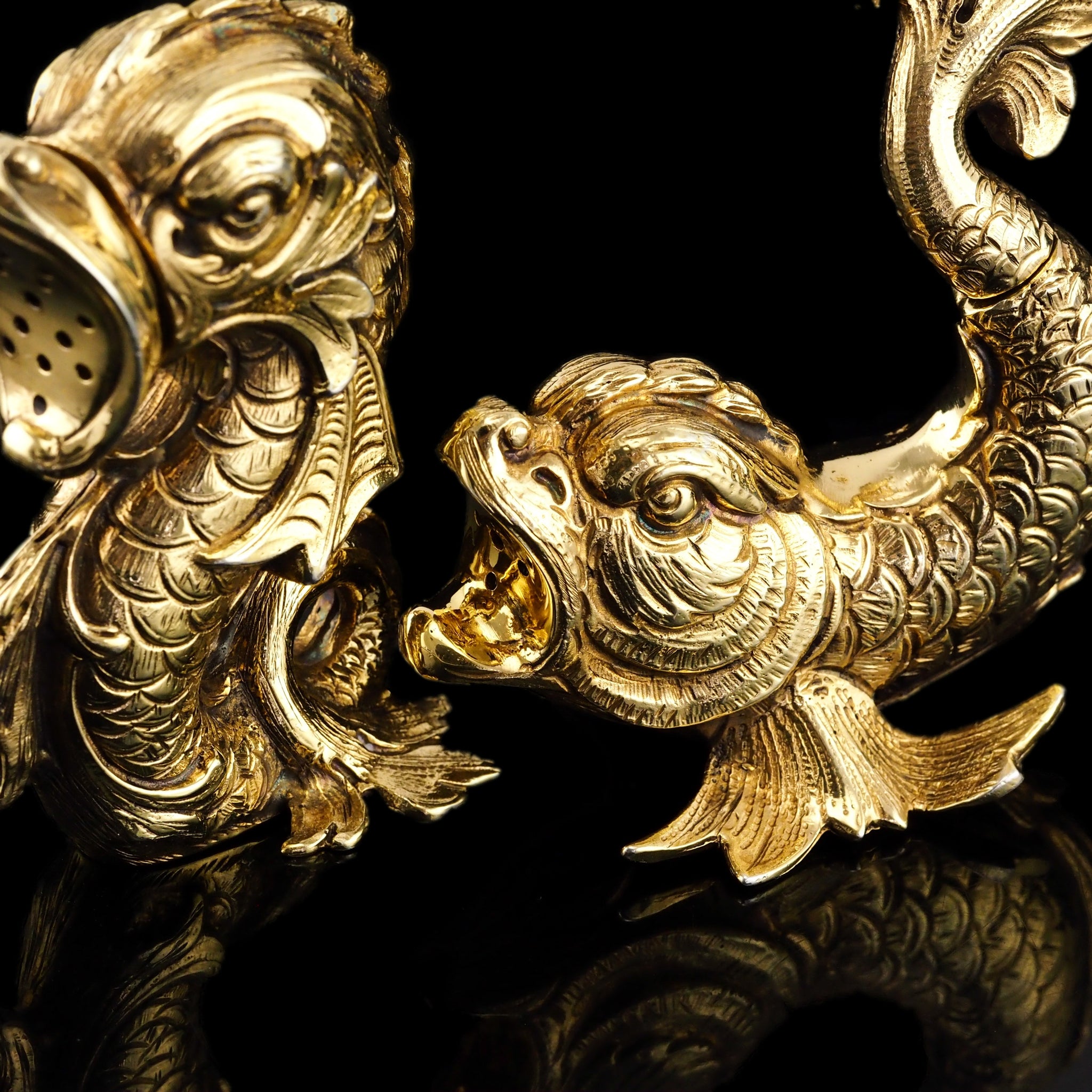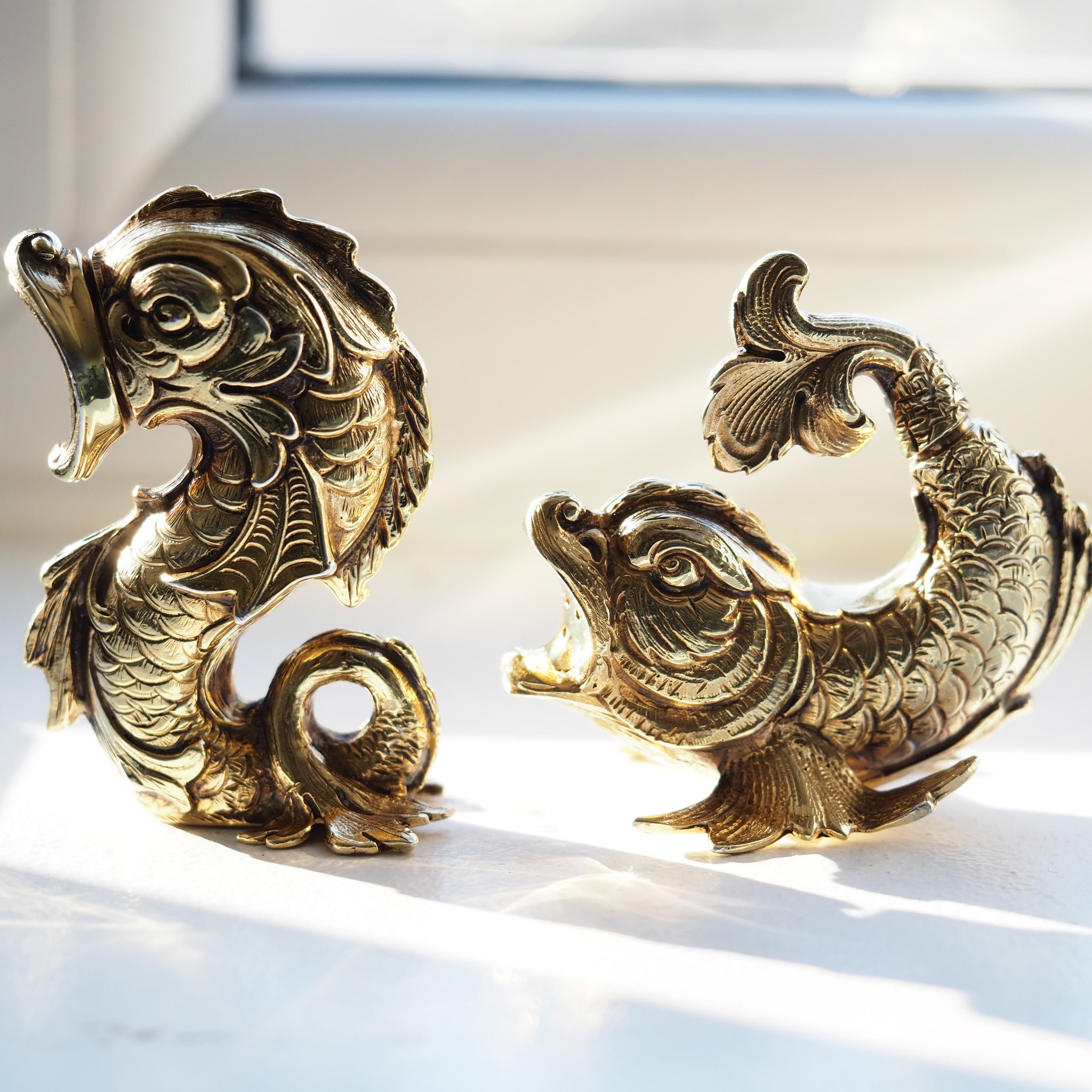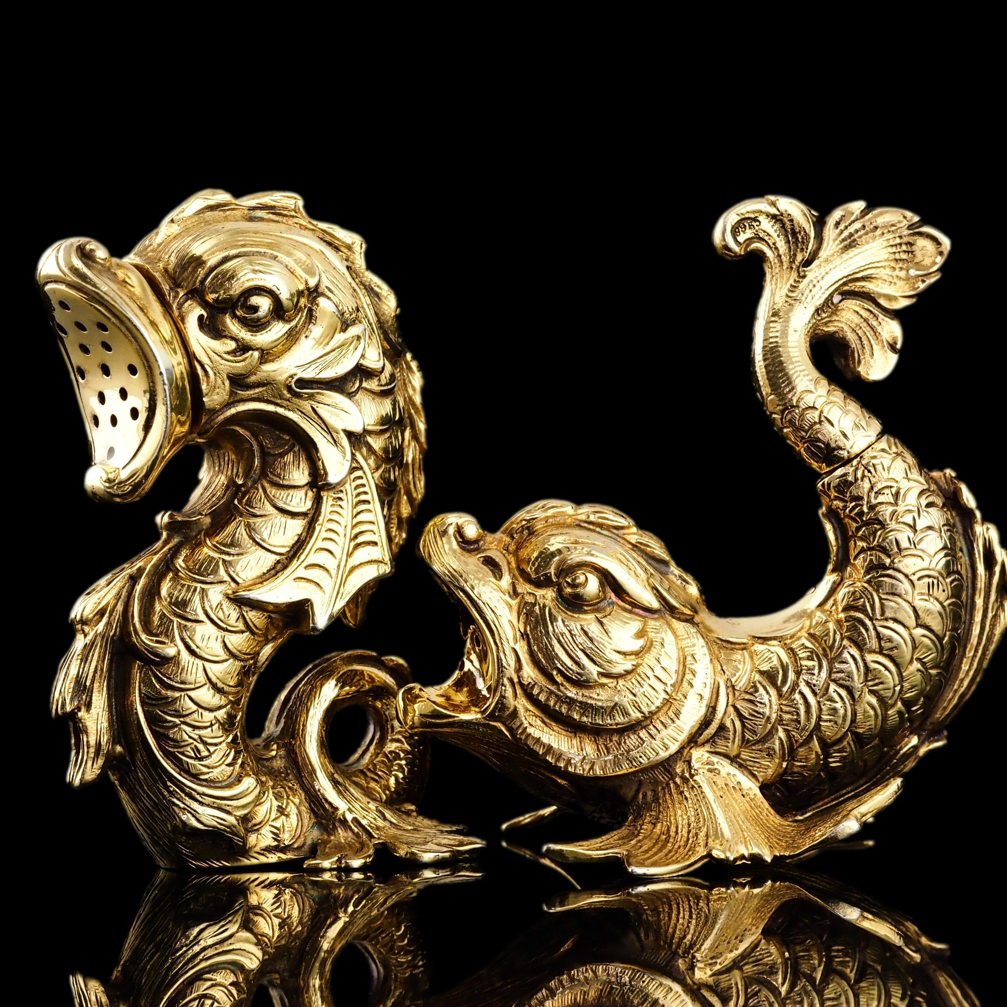 The pair feature a most ornate and wonderful mythological form of fish/dolphins and is made from an excellent gauge of silver.
